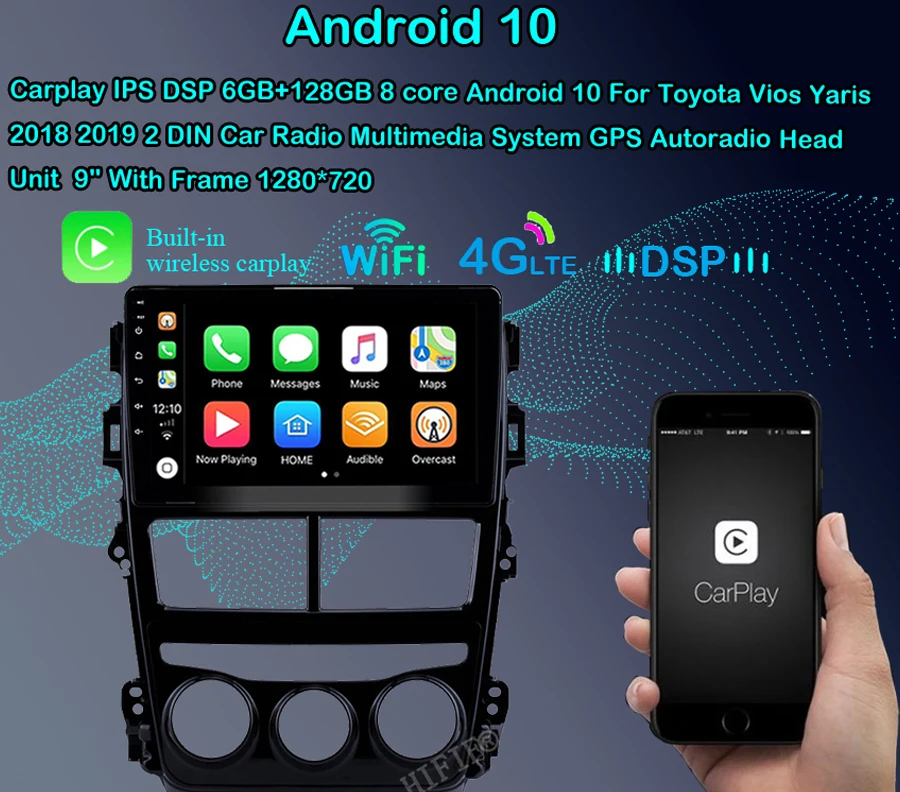 Автомагнитола для Toyota Vios Yaris 2018 2019 2 DIN, мультимедийная система, GPS, Авторадио, головное устройство Android 10 Carplay DSP 9 дюймов с рамкой