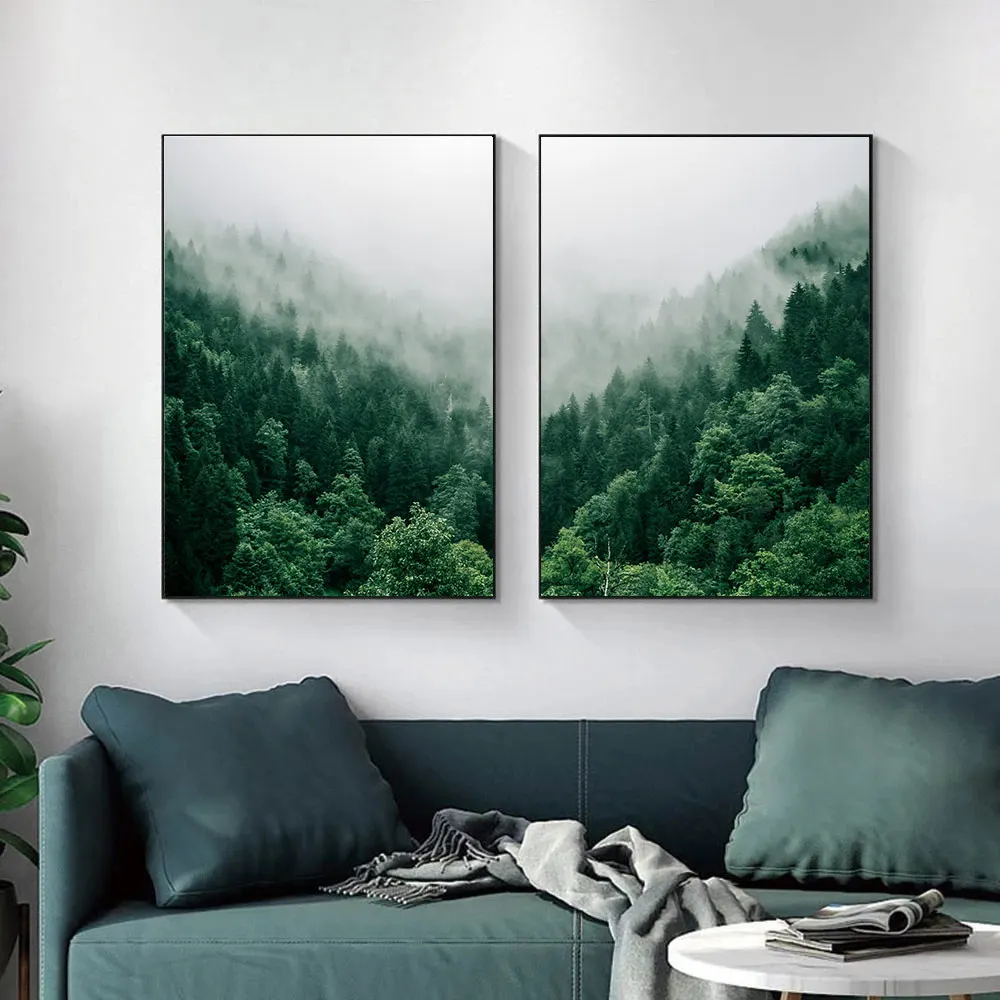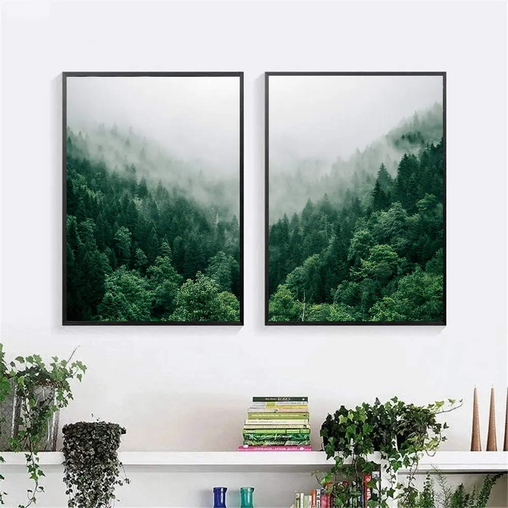 Настенная картина с изображением тумана, леса, пейзажа, на холсте, Постер в скандинавском стиле, зеленое дерево, природные плакаты, настенные картины для декора гостиной