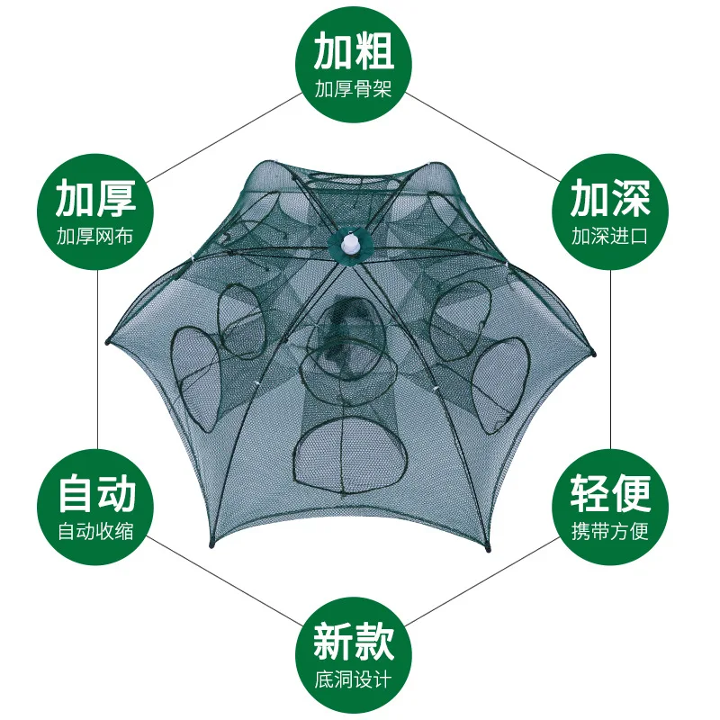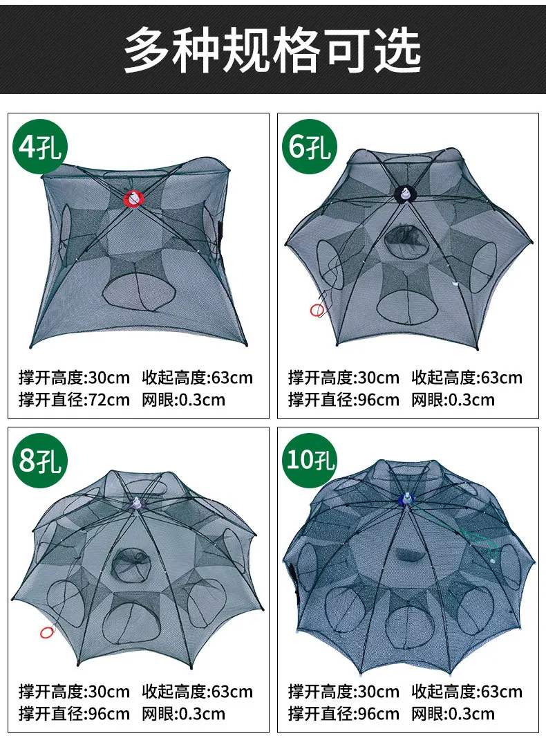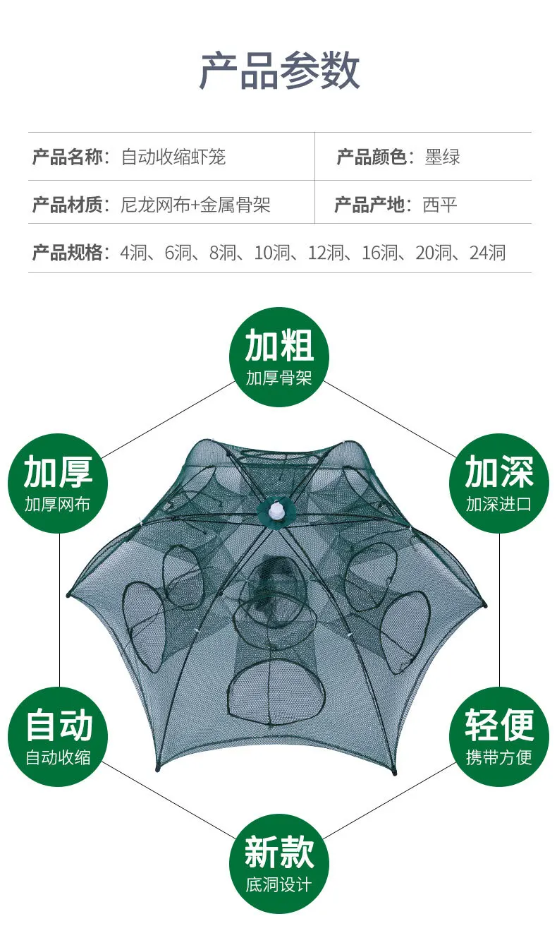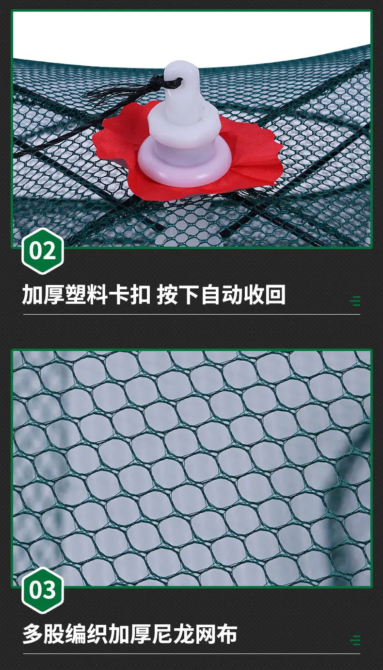 1. В этом изделии используется Толстая подставка для зонта, прочная и не ржавеет. Изготовлен вручную из изысканной полиэтиленовой сетки. Между каждыми двумя ребрами есть вход для креветок. Большое внешнее пространство и небольшая внутренняя конструкция облегчают вход, но для рыб, креветок, крабов и т. д. сложно проникнуть снаружи.