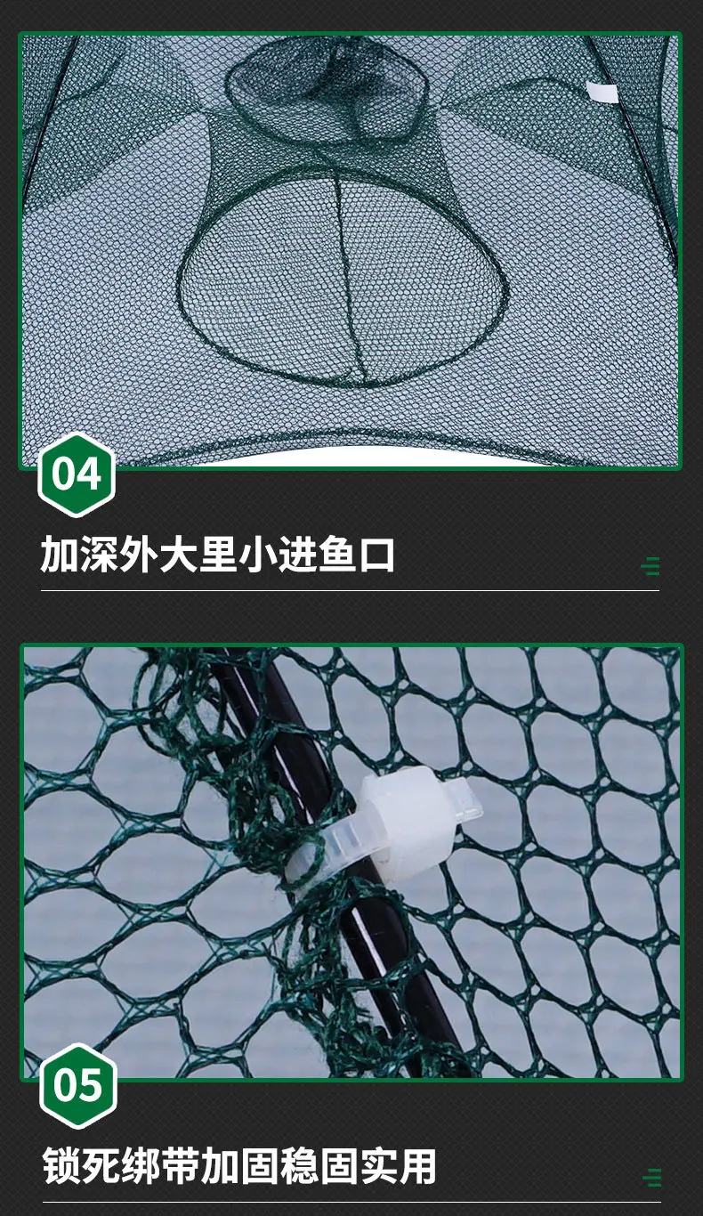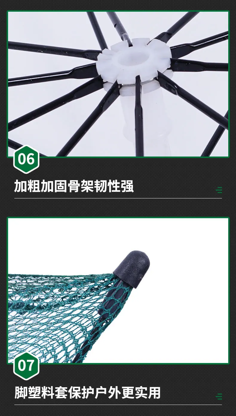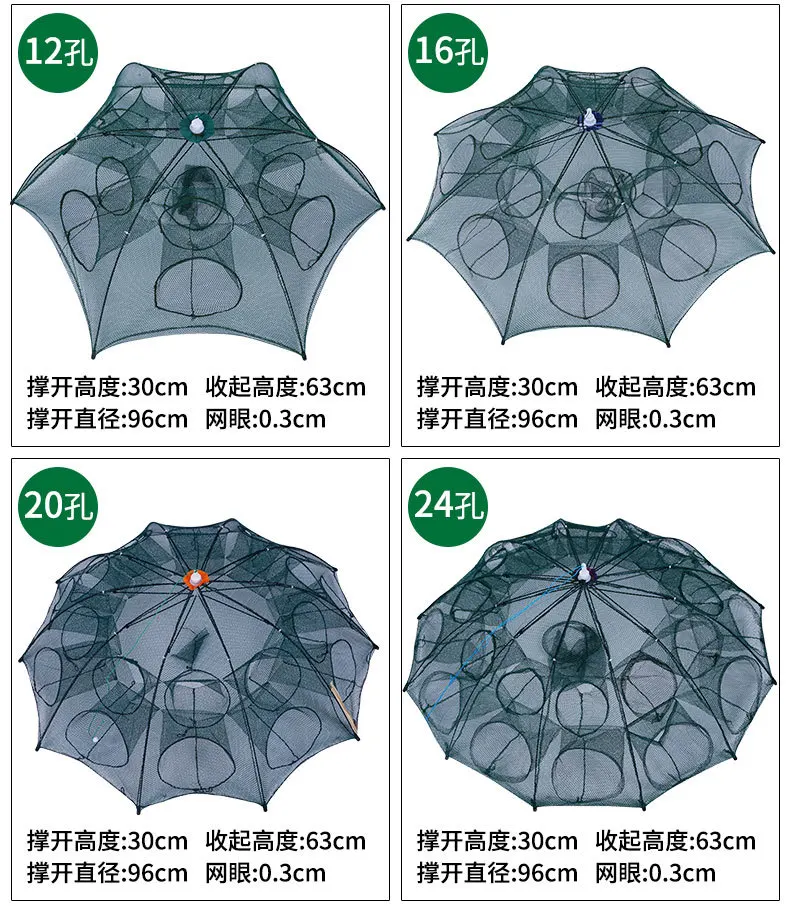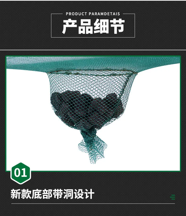 1. В этом изделии используется Толстая подставка для зонта, прочная и не ржавеет. Изготовлен вручную из изысканной полиэтиленовой сетки. Между каждыми двумя ребрами есть вход для креветок. Большое внешнее пространство и небольшая внутренняя конструкция облегчают вход, но для рыб, креветок, крабов и т. д. сложно проникнуть снаружи.