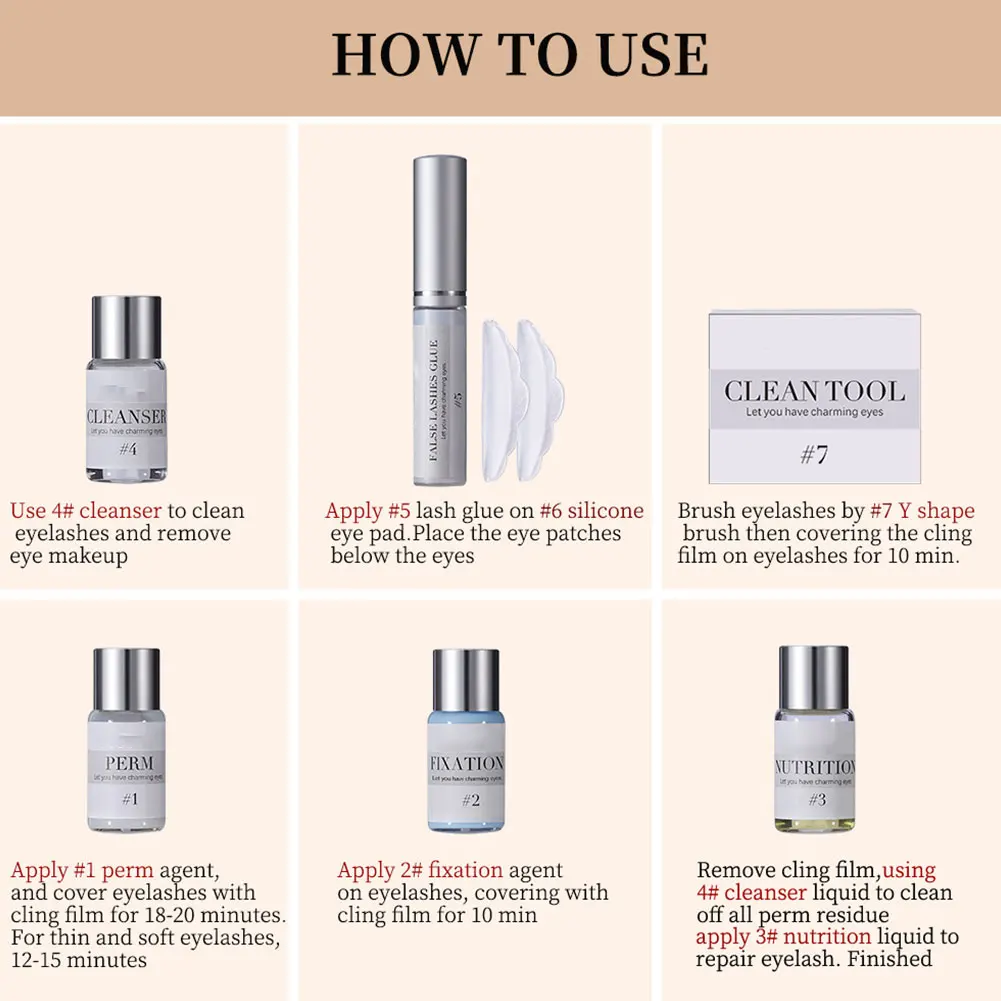 Шаг 1: Используйте очищающий лосьон #1 для очистки масла, пыли и макияжа на бровях. Шаг 2: нанесите клей на брови. Шаг 3: расчесывайте брови с помощью y-образной щетки, затем закрывайте пленку на брови в течение 10 минут. Шаг 4: нанесите на брови лосьоны № 2 perm, закрыв пленку на брови в течение 10 минут. Шаг 5: нанесите #3 лосьоны для фиксации на брови, закрыв пленку на брови в течение 10 минут. Шаг 6: Удалите пленку, используя #1 очищающий лосьон, чтобы очистить все остатки Перми. Шаг 7: наконец, нанесите #4 лосьоны для кератинового лечения для ремонта бровей. Шаг 8: Покрытие пленки на бровях в течение 10 минут. Шаг 9: Удалите нежелательные волосы вокруг бровей.