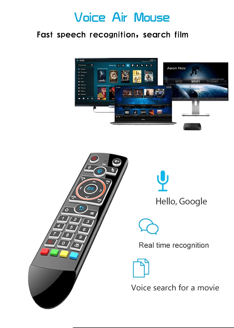 -Функция голосового поиска. Все, что вам нужно сделать, это спросить. Говорите в голосовом пульте дистанционного управления и TV Box ищет то, что вы хотите. Попросите лучшее в фильмах, в современной погоде или в последних новостях знаменитостей!