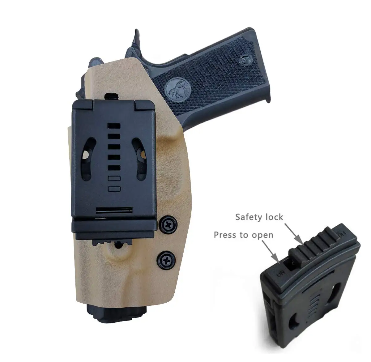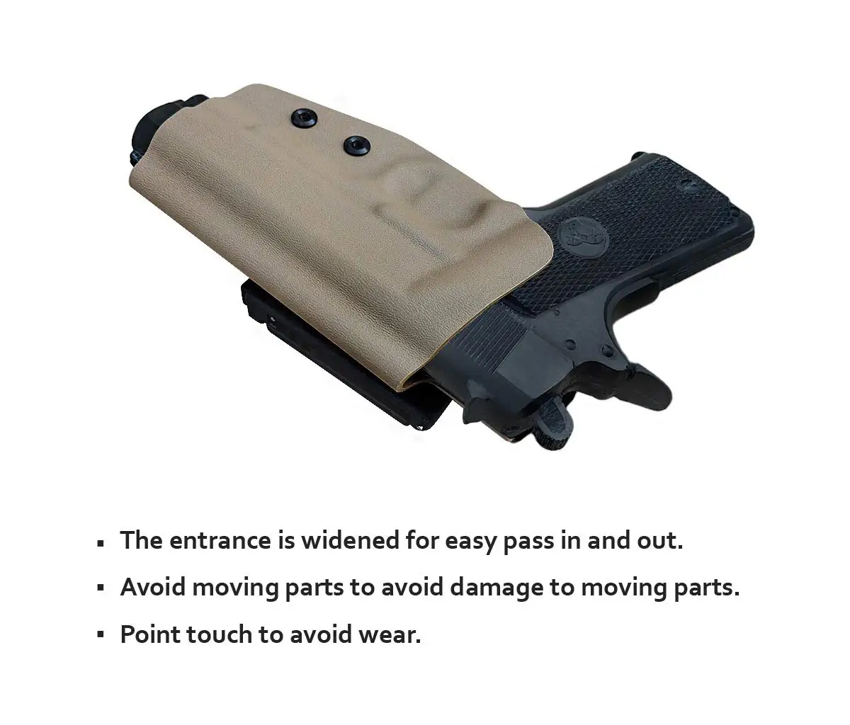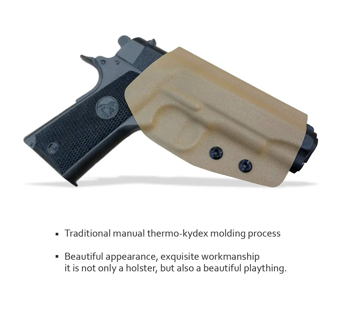 Столб. Craft Kydex 1911 кобура owb имеет звуковую систему блокировки Posi-Click, и пистолет имеет четкий звук «клик», когда он вставлен, так что вы знаете, что ваш 1911 пистолет плотно сидит. Отрегулируйте винт для достижения регулировки герметичности, чтобы достичь лучшей прочности извлечения и стремиться к самому быстрому времени хранения.