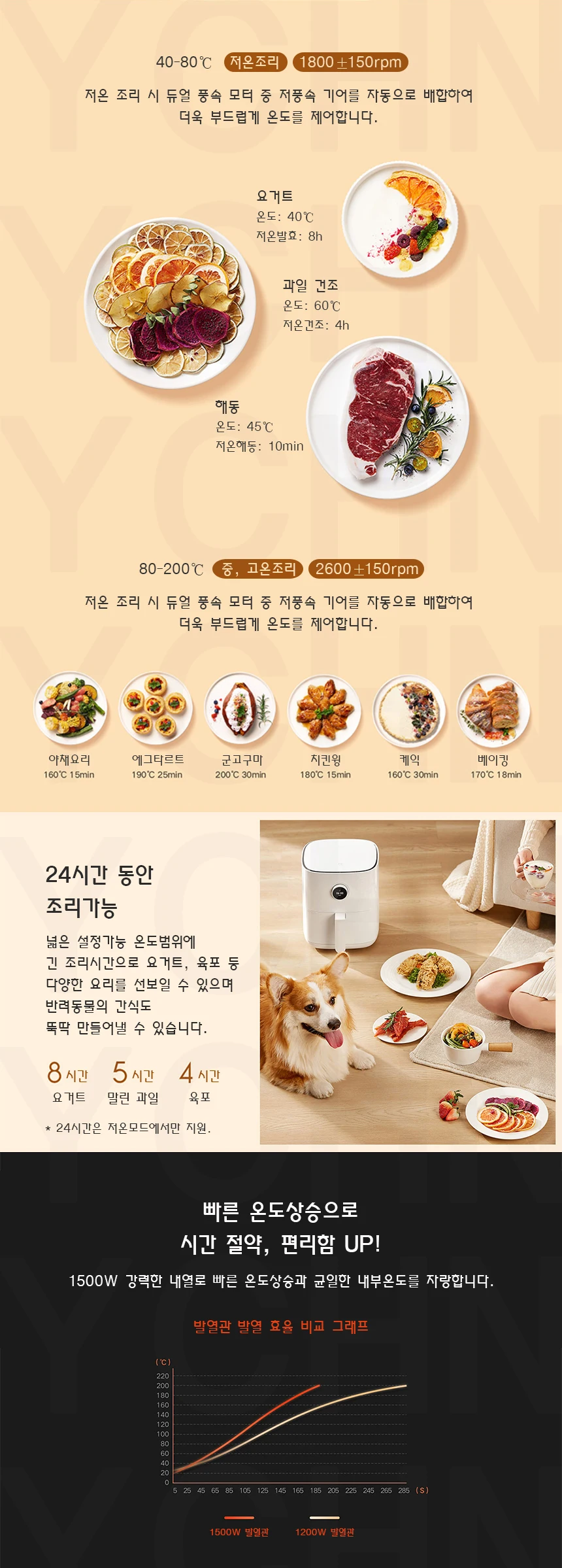 Он может быть отрегулирован в широком диапазоне температур 40-200 ℃, двухскоростной конфигурации, в дополнение к высокой температуре воздуха жарки, он также может размораживать и выпекать различные сухофрукты, овощи и мясо при низкой температуре, а также может быть ферментирован при постоянной температуре. Он объединяет функции различных бытовых приборов, таких как печи, микроволновые печи, машины для сушеных фруктов, машины для йогуртов и т. д.