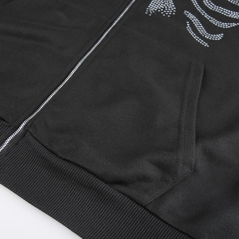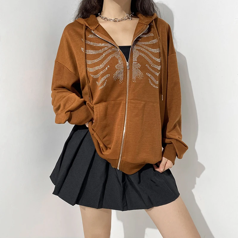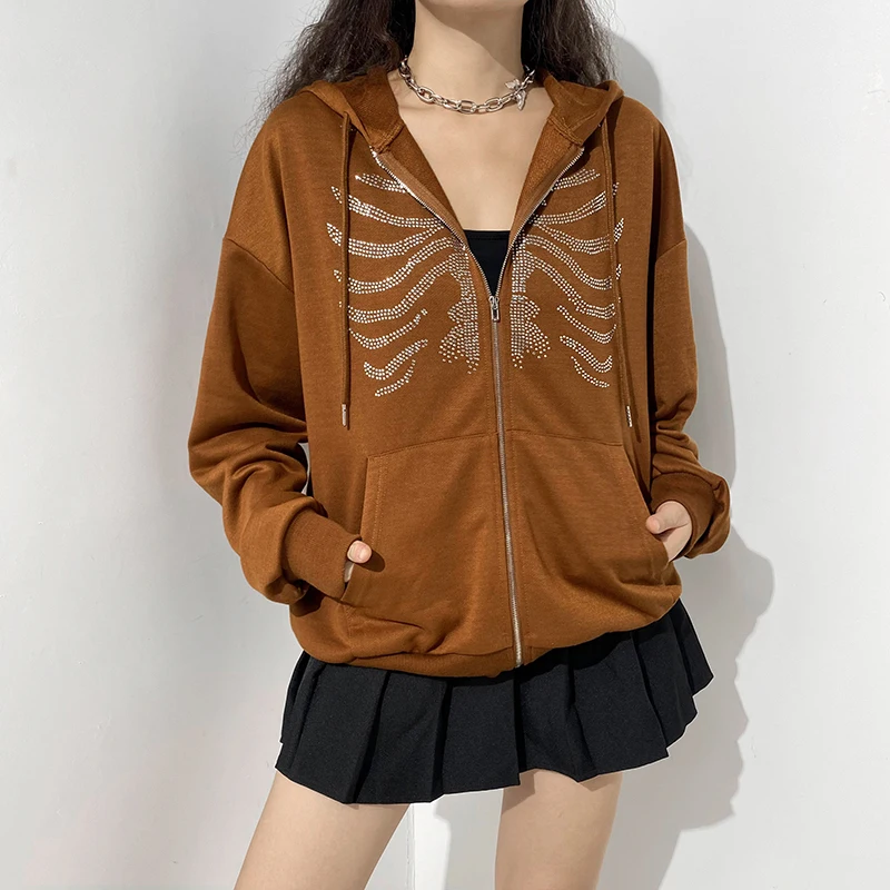 Y2K Стразы худи скелет Женская Осенняя уличная одежда на молнии гот...