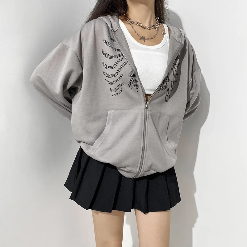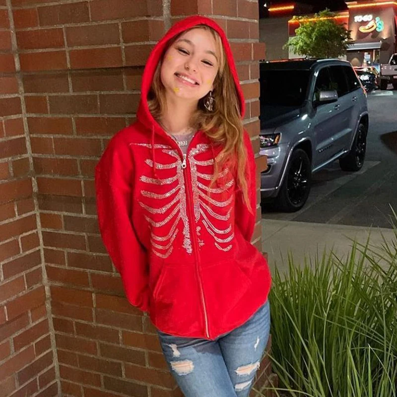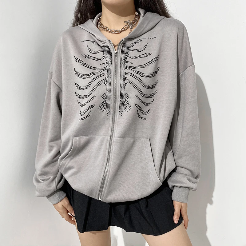 Y2K Стразы худи Скелет женские готические гранж на молнии оверсайз ...