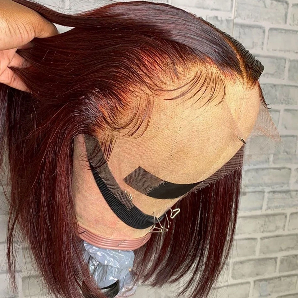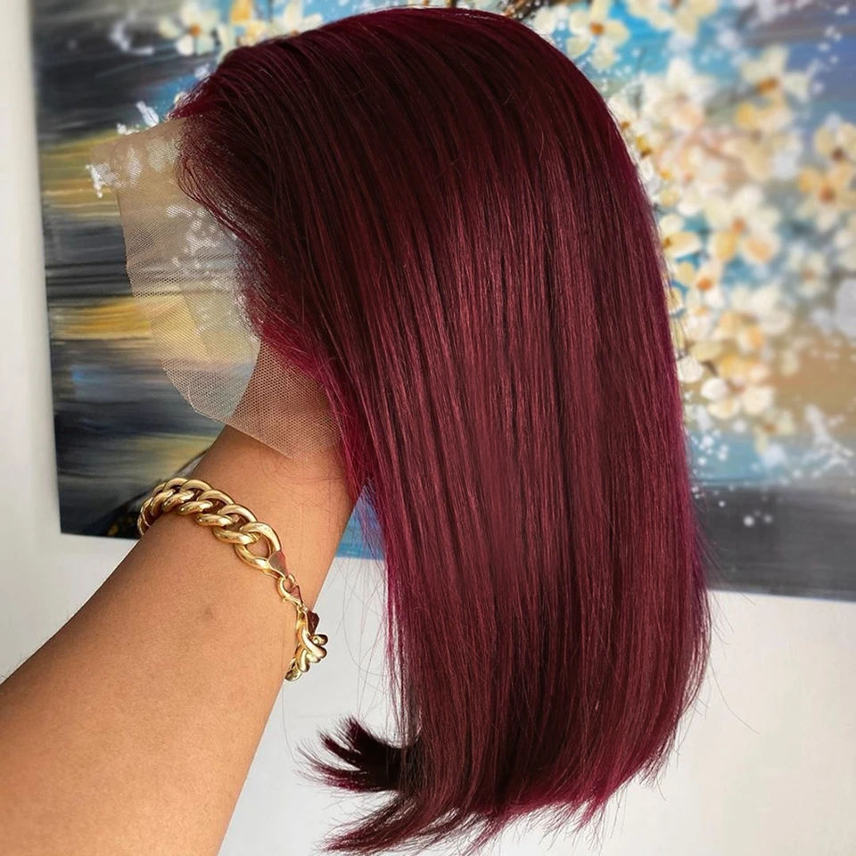 Бордовый прямой кружевной передний парик короткие волосы боб Remy человеческие волосы парики # 99J красная фотография для женщин предварительно выщипанные Детские волосы