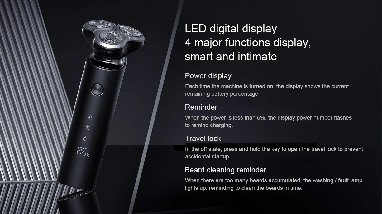 Светодиодный дисплей с 4 основными функциями Дисплей питанияКаждый раз, когда устройство включено, на дисплее отображается процент оставшейся батареи.НапоминаниеКогда мощность меньше 5%, номер питания на дисплее мигает, чтобы напомнить о зарядке.Дорожный замокВ выключенном состоянии нажмите и удерживайте клавишу, чтобы открыть дорожный замок для предотвращения случайного запуска.Напоминание об очистке бородыКогда накопилось слишком много бороды, лампа для стирки/неисправности загорается, напоминая вовремя очистить бороды.