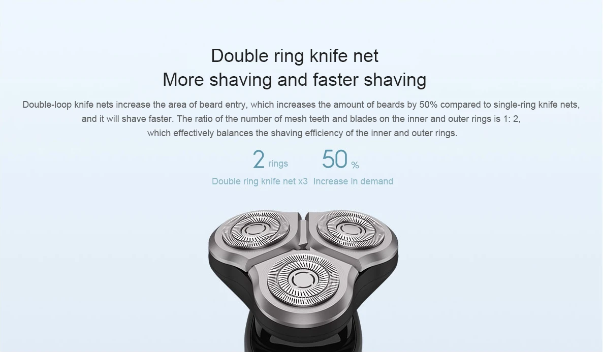 Двойное кольцо нож сеть больше бритья и более быстрое бритьеСети для ножей с двумя петлями увеличивают площадь входа в бороду, что увеличивает количество бороды на 50% по сравнению с сетками для ножей с одним кольцом, и они будут бриться быстрее. Соотношение количества зубьев сетки и лезвий на внутреннем и внешнем кольцах 1: 2, что эффективно балансирует эффективность бритья внутренних и внешних колец.