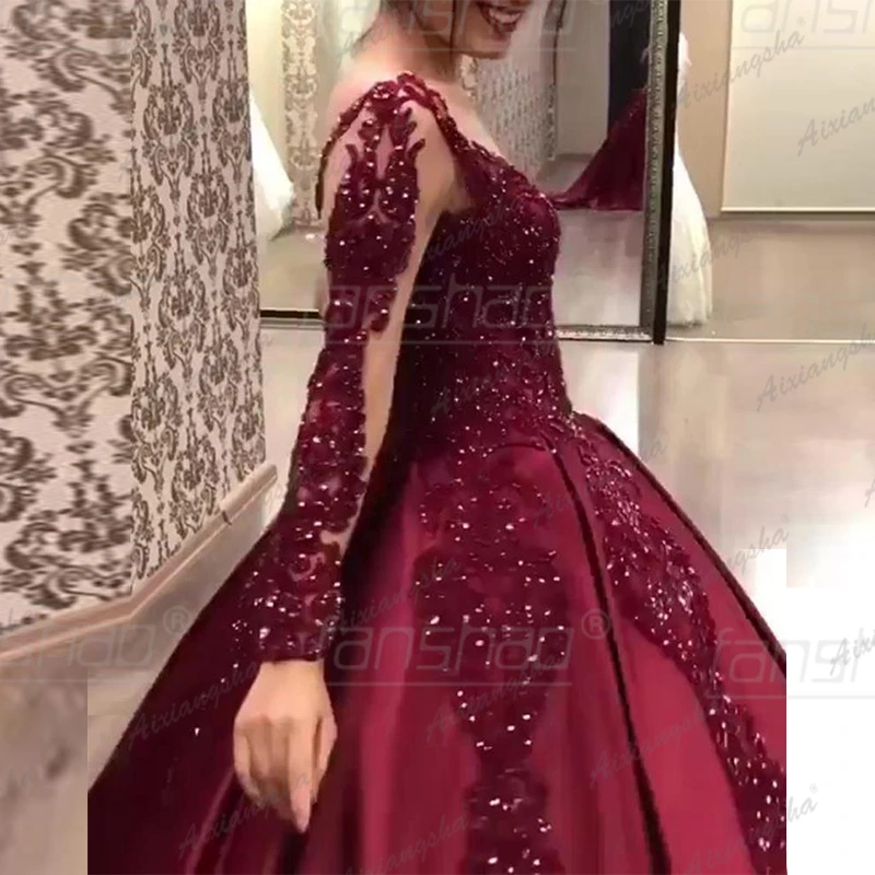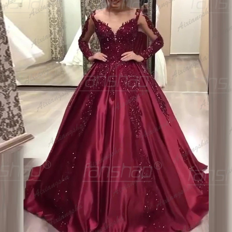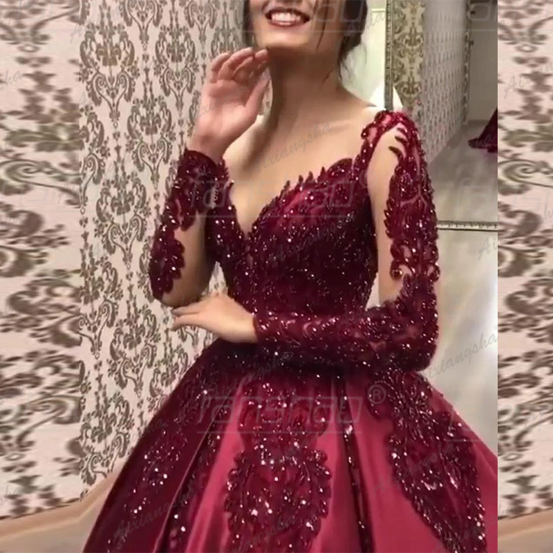Женское вечернее платье с блестками Fanshao, бордовое Прозрачное платье с круглым вырезом и длинными рукавами, бальное платье для выпускного вечера