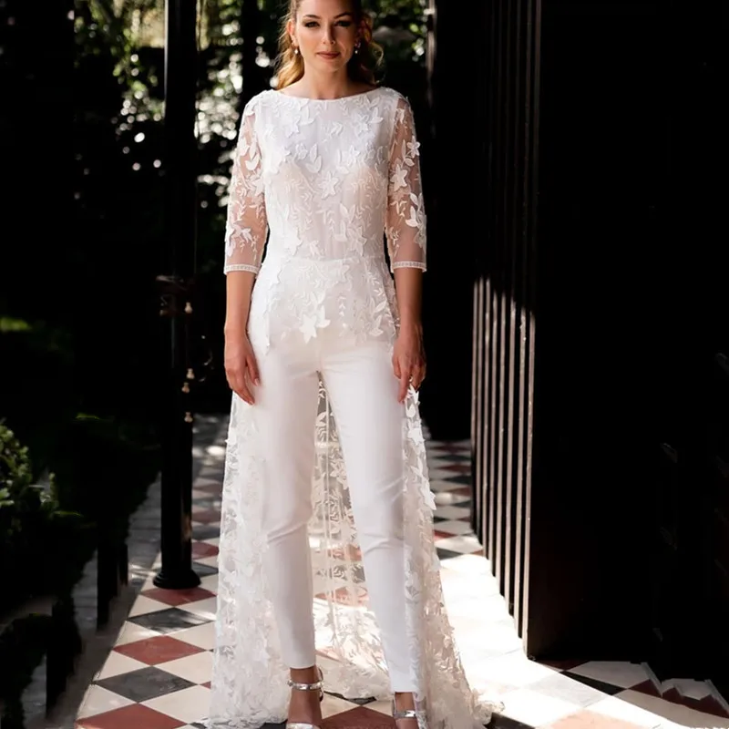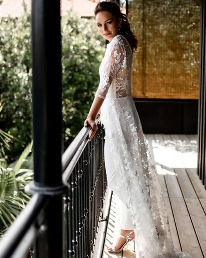 Элегантный комбинезон в стиле бохо, свадебное платье с круглым вырезом и кружевной аппликацией, рукав 2021, с открытой спиной, из тюля, на пуговицах, простое платье невесты, платье для невесты, 34
