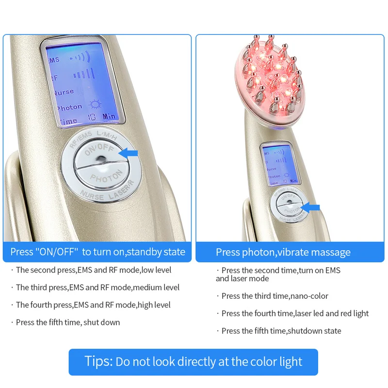 Инновационные технологии 1,7 в 1: Инфракрасный светильник, низкочастотный RF, нано-красный светильник, Электропорация, EMS микроэлектричество, вибрационный массаж и RF. 2. Комбинированное действие 3 лучей светильник плюс функция массажа значительно увеличивает силу волос, улучшает качество волос и предотвращает выпадение волос 3. Помогает развивать круг крови, расслабляет и снимает усталость. Частое использование может предотвратить головную боль или периодическую головную боль 4. Предотвращает выпадение волос и делает волосы более густыми, сильными и здоровыми 5. Впечатляющее продвижение в домашнем лечении волос лазером 6. Сочетает в себе лазерную фототерапию, которая направляет питающую, низкоуровневую энергию лазерсветильник в ваши волосы с биостимулирующей технологией вибрации для стимуляции кровообращения 7 светильник используется для очистки корней волос и делает волосы гладкими и здоровыми. Для достижения наилучших результатов используйте каждые 10 минут