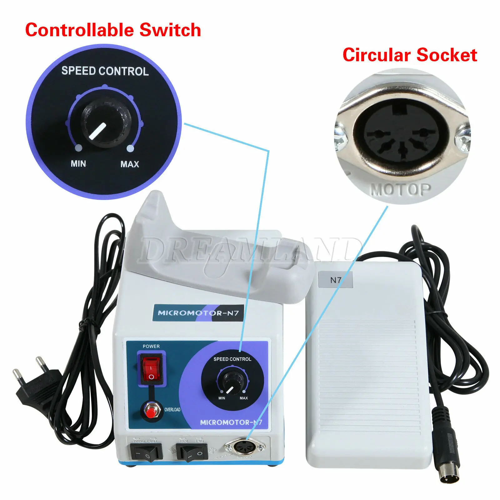 Micro motor marathon machine N7-это инструмент, изготовленный с двигателем для использования как карандаш и используемый для работы с поворотным усилием от вращающегося двигателя до 35000 об/мин. И применяется для резки, шлифования, полировки. Доступны различные боры в зависимости от материала и способа работы. Продукты в основном используются для стоматологической лаборатории и стоматологической клинике. Диапазон использования был постепенно расширен для ювелирных изделий, ногтей, гравировки, ортопедии, промышленного рынка, красоты резьбы по дереву, резьба по яичной скорлупе и т. Д.Характеристики продукта:1. Компактный блок управления,Очень мощный и качественный 0-35000 об/мин.2. Система неступенчатой скорости.(Он хорошо разработан для вывода от нуля до 35000 об/мин с помощью неступенчатой системы скорости)3. Правая и левая Поворотная способность система включения/выключения (педаль с переменной системой управления)Новая система контроля скорости;Два вида способов контроля скорости.Технические характеристики:Диапазон скорости. ................... 0-35000 Р. М.Напряжение. ...........................(A)220V/50Hz ± 10%(B)110 В/60 Гц ± 10%Вес ........................... 2 кгСтоматологическая лаборатория марафон наконечник высокоскоростной для клиник:Особенности: