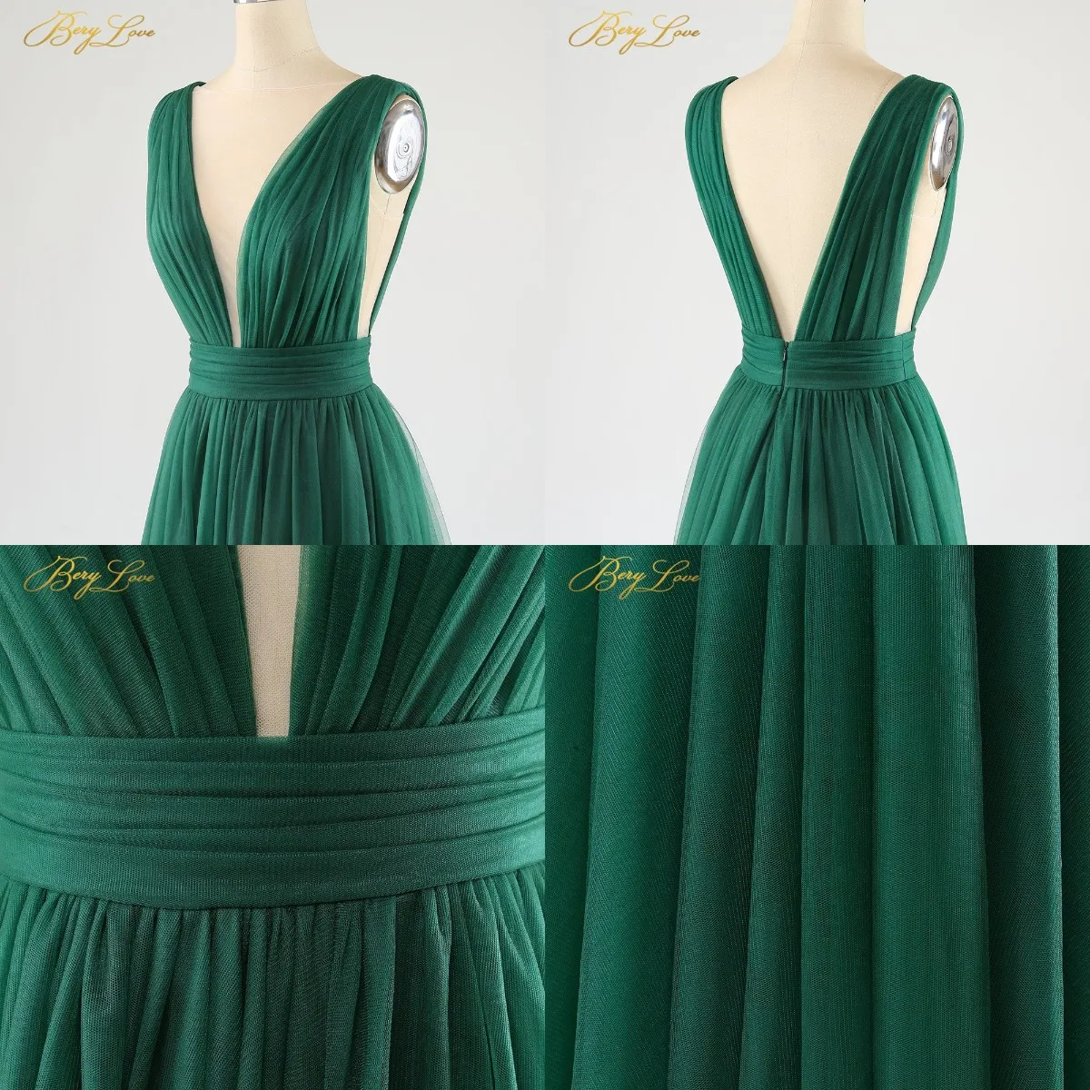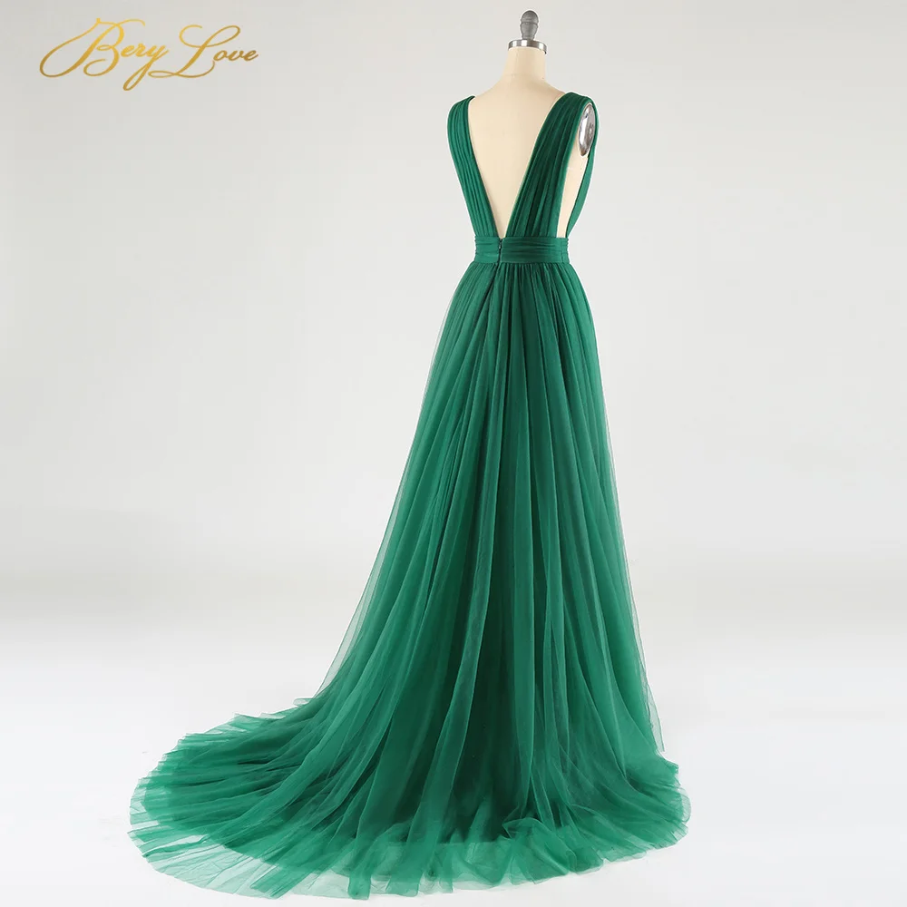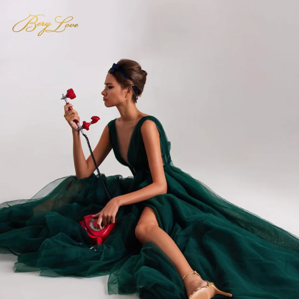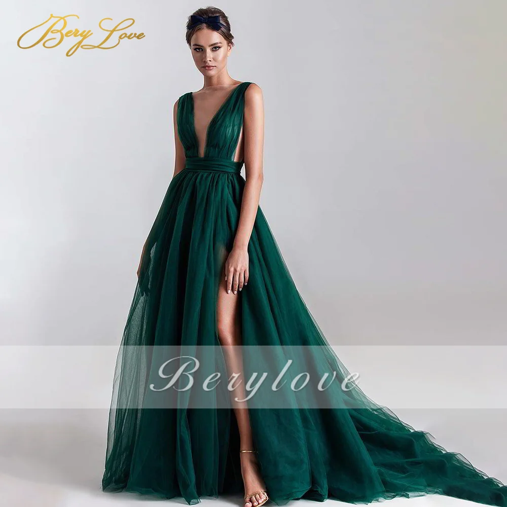 Зеленое вечернее платье-трапеция Berylove, длинное платье из струящегося тюля для выпускного вечера, вечерние нее платье с глубоким V-образным вырезом и Боковым Разрезом, официальное элегантное платье для вечеринки