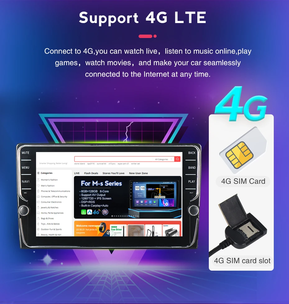 >Поддержка4G SIMКарта и Wi-Fi, где бы вы ни находились, вы получите удовольствие от интернет-серфинга, сделайте его возможным для онлайн-навигации/музыки/фильмов и т. Д.