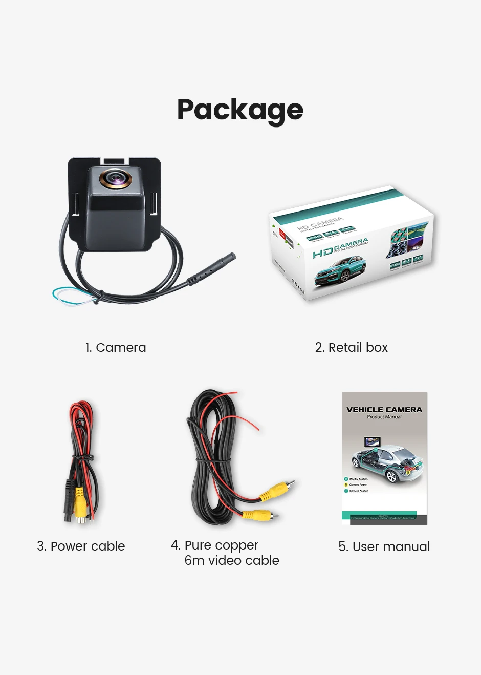 1. Камера заднего вида2. Розничная коробка3. Кабель питания4. Чистый медный 6 м видео кабель5. Руководство пользователя
