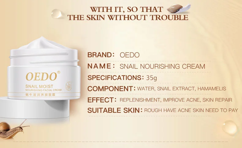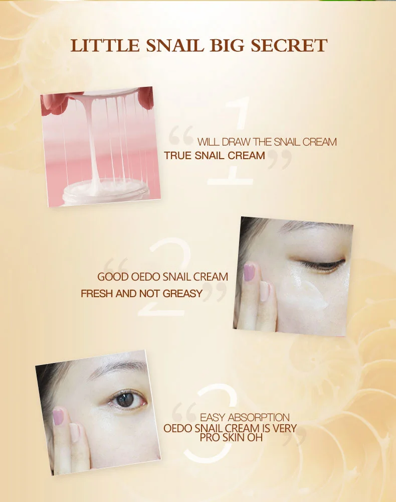 Содержит эссенцию экстракта улитки, ее текстура мягкая и влажная, нежная и мягкая на ощупь, легко впитывается кожей. Улучшает тусклую кожу, восстанавливает влагу и питание, защищает сухую и грубую кожу. Борется с морщинами, делая кожу упругой и нежной, она также на сохранить увлажнение кожи уровень, оставляя кожу влажной и гладкой, с молодостью и блеском.