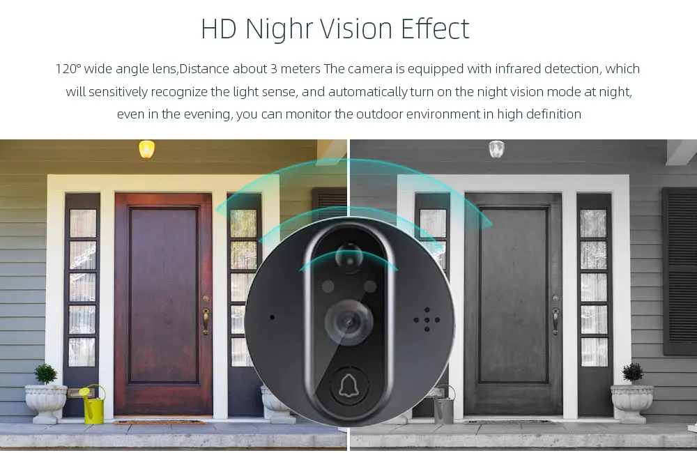 Угол обзора 120 ° и высокочувствительный датчик движения PIR. При обнаружении событий движения дверной звонок сразу же проснется, и вы получите оповещения о том, что приложение нажимает. Затем вы можете дать предупреждение на языке для подозрительных людей на открытом воздухе