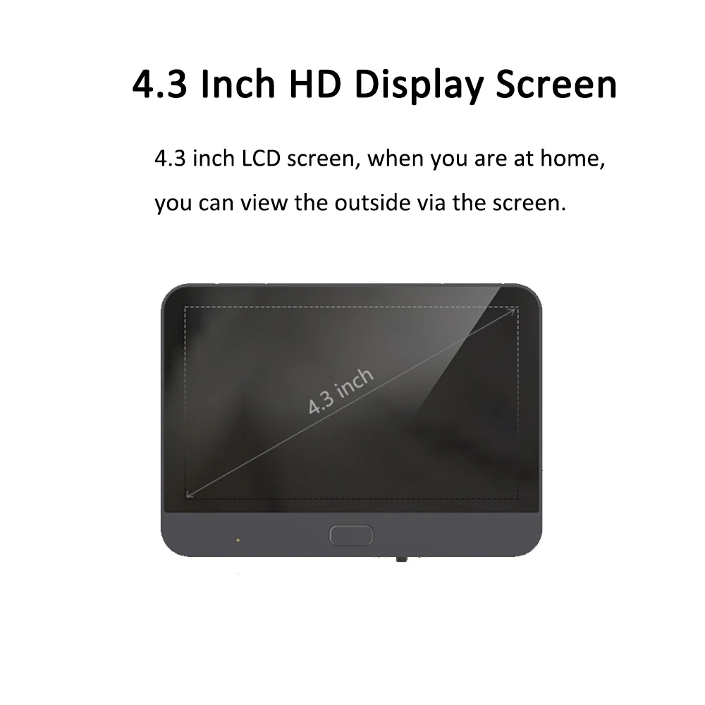 -720P HD видео-дверной звонок камеры, беспроводной дверной 4,3 дюймовый экран дисплея-Встроенный перезаряжаемый аккумулятор 5000 мАч и usb-кабель 5 в 1 а, с сигнализацией низкого заряда батареи-Оповещение о тревоге. Когда кто-то нажимает на дверной звонок, вы получите уведомление о том, что приложение нажмет-Двухстороннее аудио. Четко общаться с посетителями в режиме реального времени-Четкое ночное видение. Обеспечивает мониторинг днем и ночью-Обнаружение движения PIR. Угол обзора 120 °, когда дверной звонок обнаруживает движение, приложение будет нажимать уведомление-Видеозвонок. Когда кто-то нажимает дверной звонок, вы получите видео звонок в любом месте-Поддержка sd-карты Max 64G (не входит в комплект) и облачного хранилища для записи сигнала тревоги-Загрузите бесплатное приложение «Smart Life» или «TuyaSmart» из Google Play или AppleStoreG