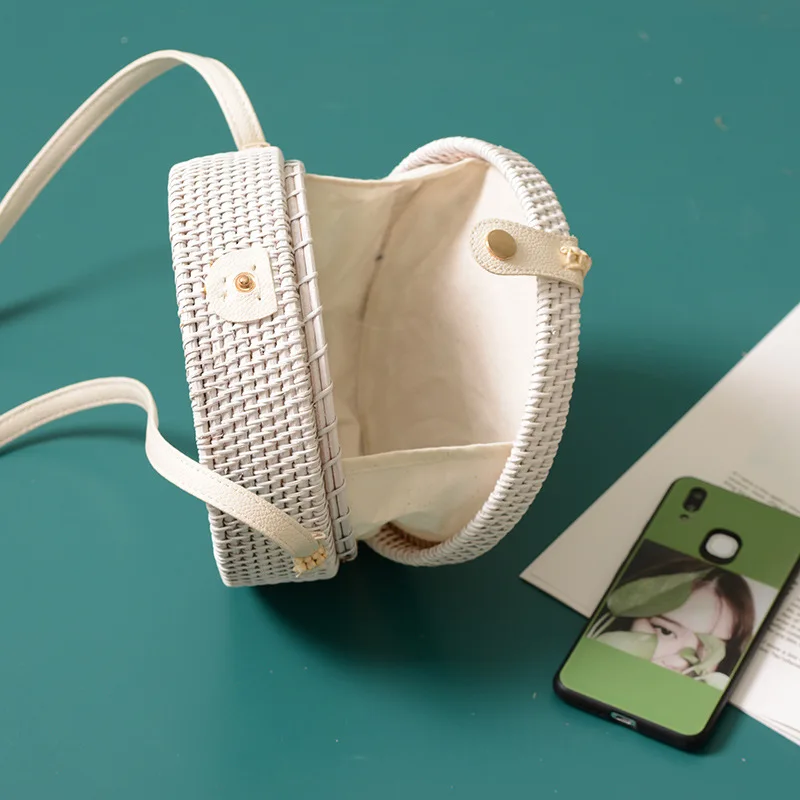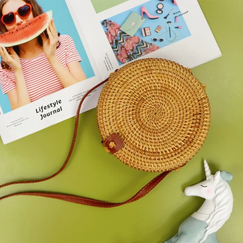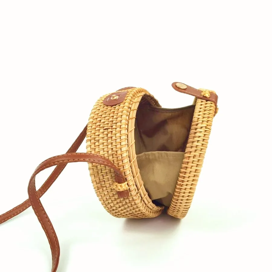 Женская винтажная кожаная сумка, круглая пляжная сумка ручной работы из ротанга с Бали, маленькая богемная сумка через плечо, 2021