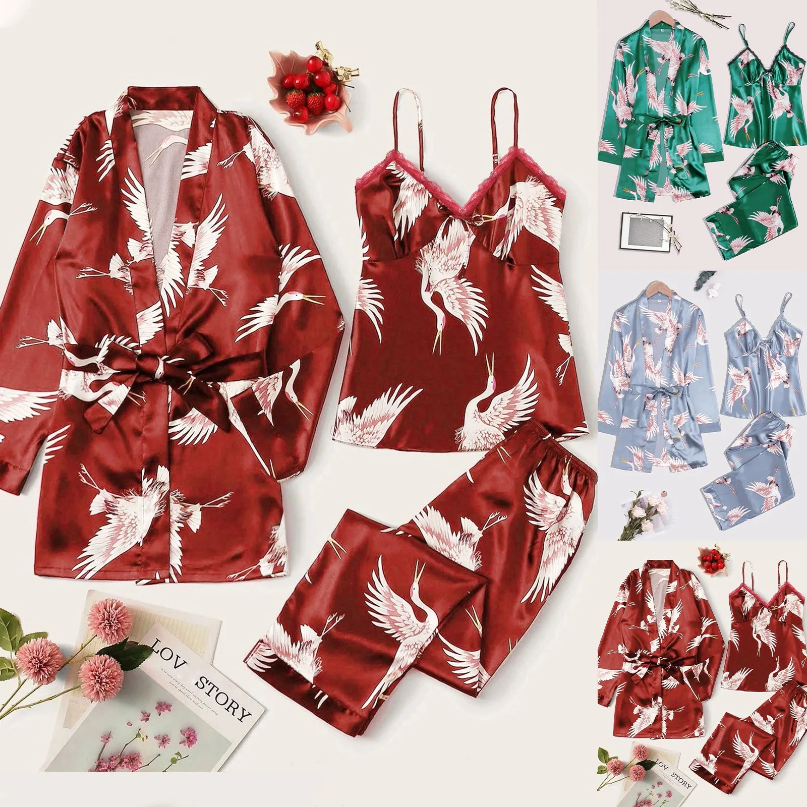 Пижамный комплект женский Шелковый атласный, комплект из 3 предметов, одежда для сна с длинным рукавом и коротким рукавом, ночная рубашка, летняя Пижама