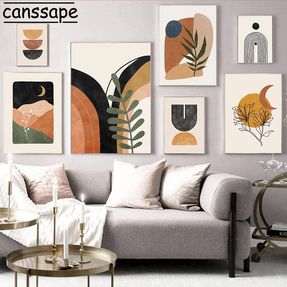Настенные картины в стиле бохо с изображением монстера, пальмы, солнца, луны, настенные плакаты, геометрический постер, украшение, абстрактное искусство, живопись, Настенный декор
