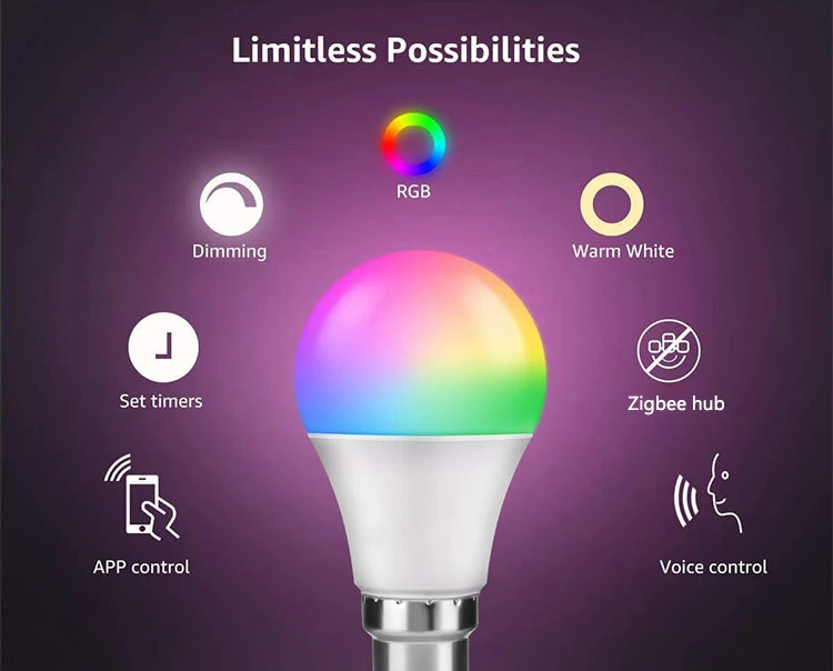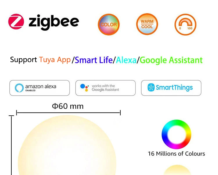 -Контроль Zigbee-Простая установка, хорошо работает-Наслаждайтесь своей умной жизнью: умная Светодиодная лампа Zigbee 3,0 может управлять голосом через Alexa Echo / Google Home через концентратор SmartThings или Tuya Zigbee hub, гораздо удобнее управлять освещением.-Бесплатное дистанционное управление с помощью приложения: светодиодный смарт-лампочка с пультом дистанционного управления с вашим телефоном через приложение Smart Life/Tuya Smart независимо от того, где вы находитесь.-Групповое управление: вы можете контролировать светодиодный светильник индивидуально или создавать различные группы, чтобы контролировать светодиодный светильник с регулируемой яркостью. Управляйте всеми огнями одновременно, создавая группы и добавляя свои огни в вашу группу.-DIY Цветовая насыщенность: RGB + CW(2700K-6500K) , 16 миллионов цветов, 7 сцен доступны для выбора. Просто Украсьте свой дом всем, что вам нравится.-Работа с шлюзом Tuya Zigbee: пока вы подключаете лампу к шлюзу Tuya Zigbee, вы можете использовать Alexa или Google Home для управления лампочкой. Так что вы можете легко включить/выключить лампу, отрегулировать цветовую температуру или яркость только вашим голосом.-Просыпайтесь с вашим любимым светильник: с функцией таймера, он может быть настроен для включения с вашим любимым светильник утром, когда ваш обычный сигнал тревоги выключается.-Обмен: обмен устройствами с вашими семейными мужьями. Для этого вы можете наслаждаться высококачественной жизнью с семьей