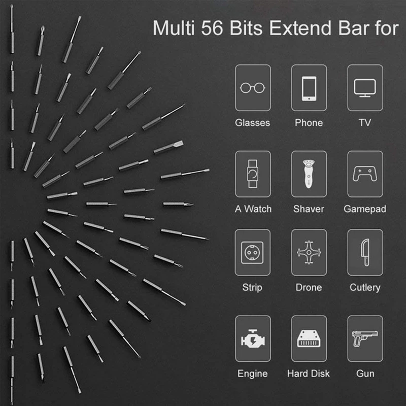 56 международных стандартных партий C4, все изготовлено из сплава S2 T стали.Специально подобранные с 4 обычно используемыми 45 мм длинными партиями головками для глубокой работы с отверстиями без давления.Очки/смартфон/компьютер/жесткий диск/Apple watch/бритва/геймпад/Дрон