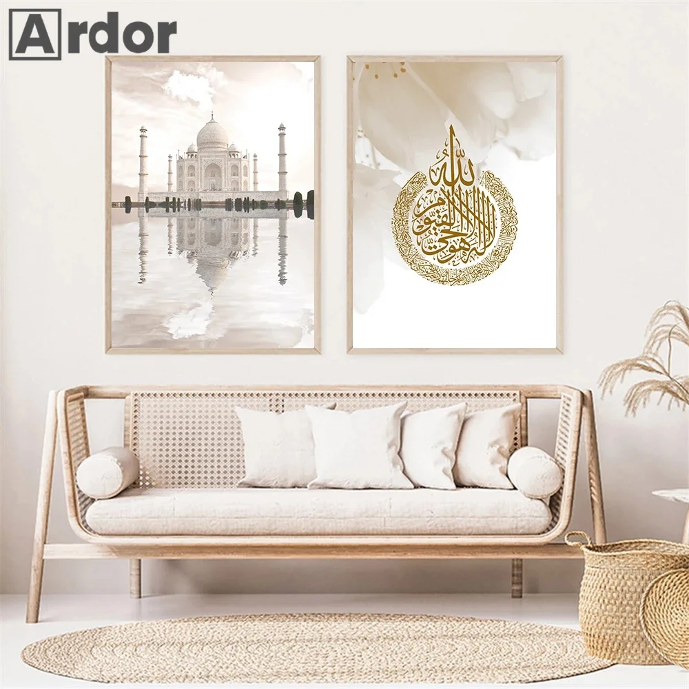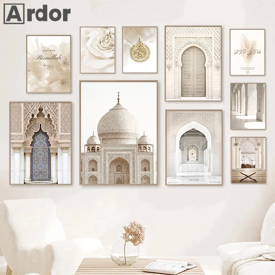 Постер исламской архитектуры, Настенная картина бежевой двери мечети, Картина на холсте, картины с цветами, каллиграфия, богемный Декор для гостиной