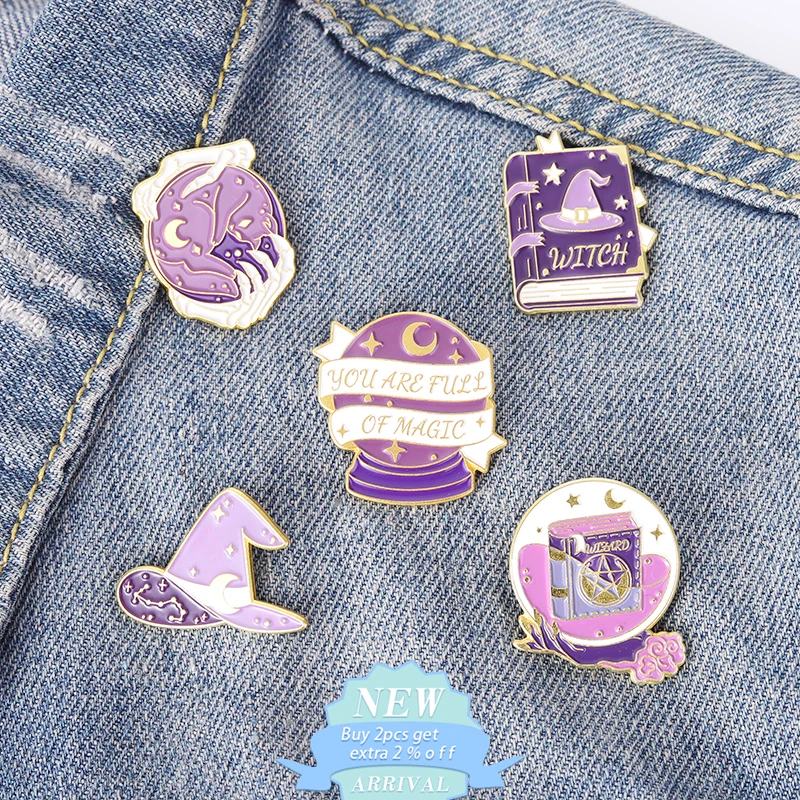 Хрустальный шар замка ведьма эмалевые булавки Волшебная Шляпа заклинание книга Луна Звезда Кот волшебник броши значки для ведьмаков Хэллоуин ювелирные изделия