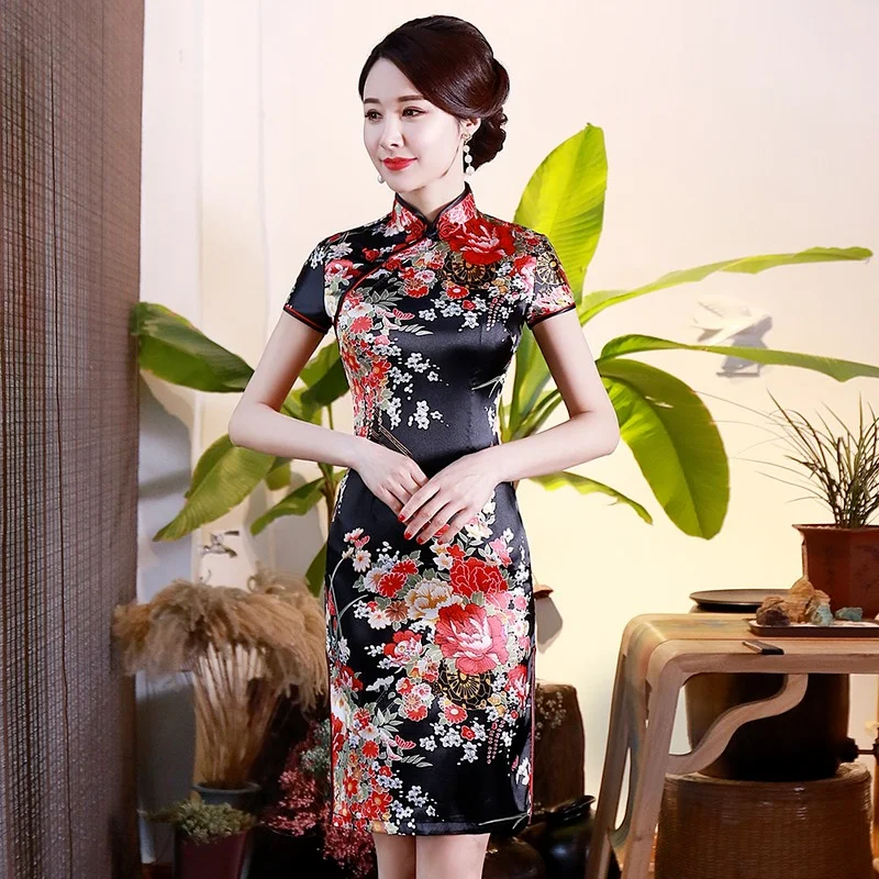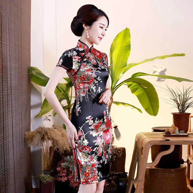 Женское Короткое платье Ципао, из искусственного шёлка, с цветочным принтом, традиционное китайское платье размера плюс, S-6XL