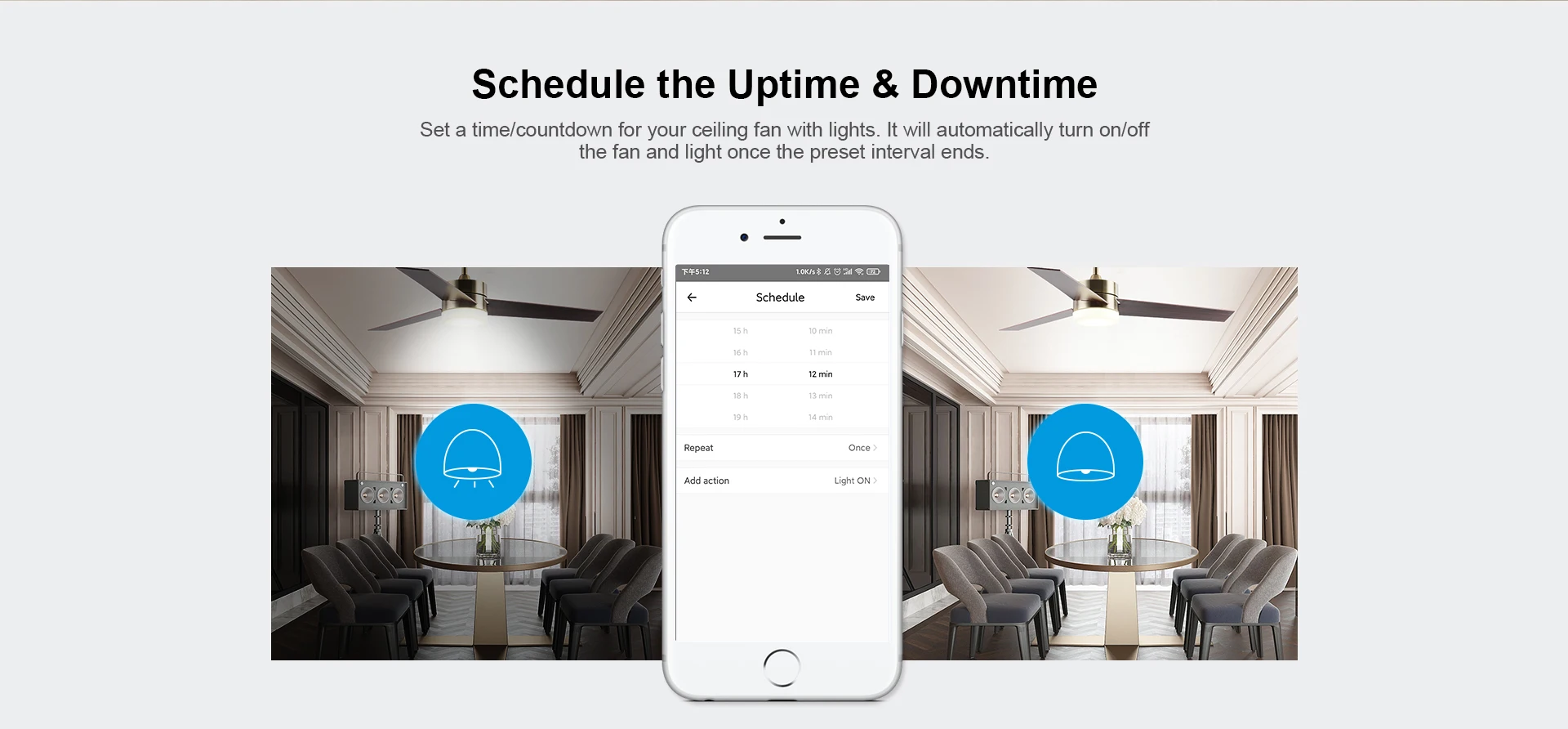 Установите время/Обратный отсчет для вашего потолочного вентилятора с подсветкой. Он автоматически включит/выключит вентилятор и светильник, как только заданный интервал заканчивается.