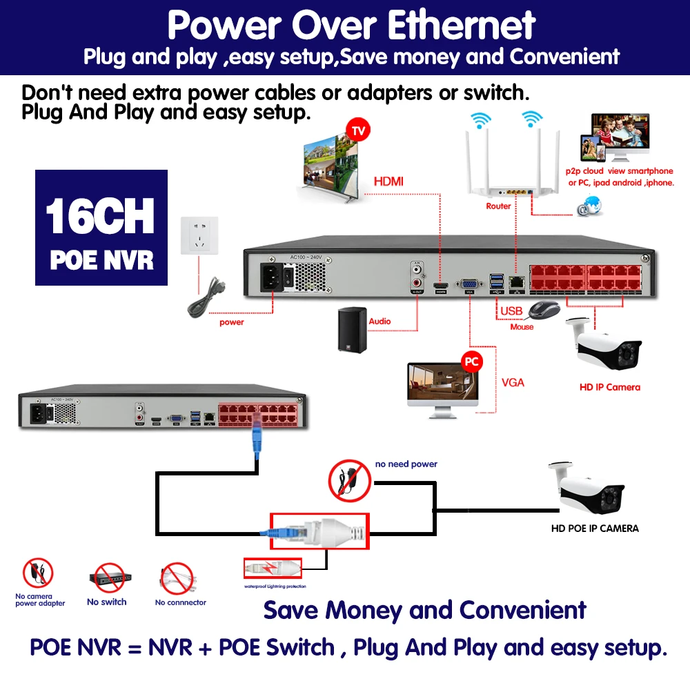 Нет дополнительных кабелей питания или адаптеров, просто подключив ip-камеру к NVR с помощью одного кабеля, вы можете легко завершить установку без знания о компьютере или сети и начать наслаждаться супер простым мониторингом среди вашего смартфона, планшета или ПК.