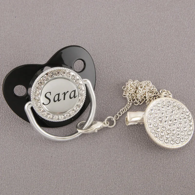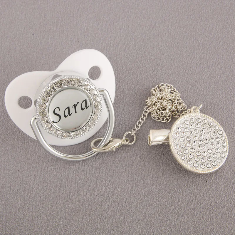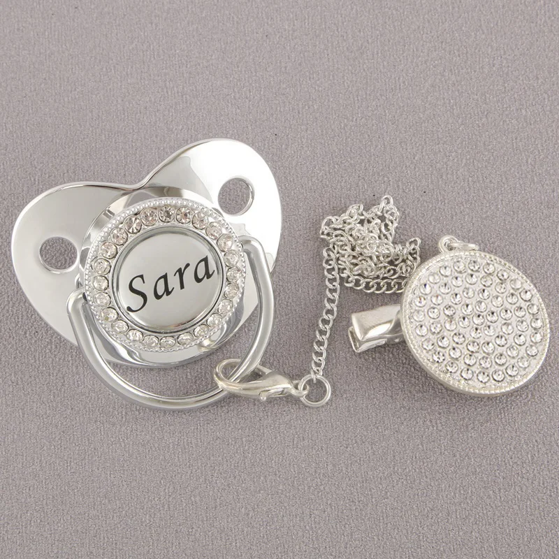 Роскошная Персонализированная Детская Соска с зажимом с любым именем BPA бесплатно Соска-пустышка Teat Chupeta Sucette Блестящая серебряная соска для младенцев