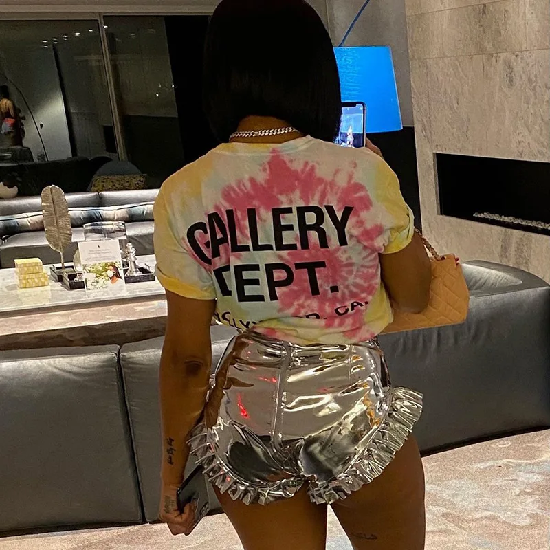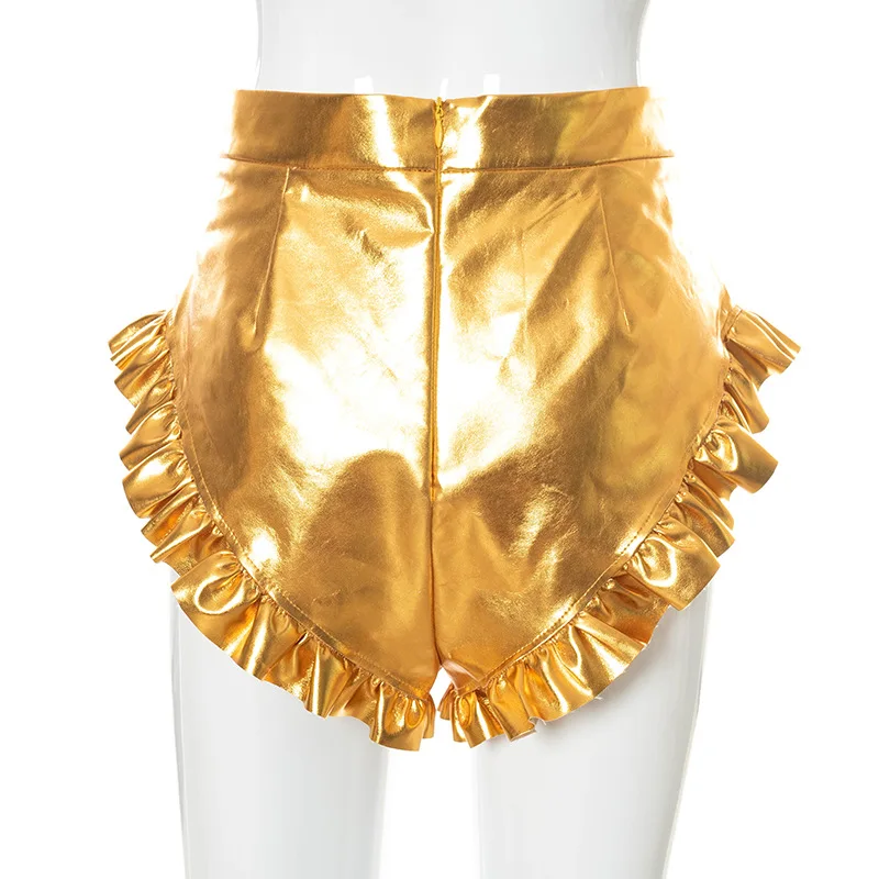 Женские блестящие шорты с металлическим отливом, летние однотонные шорты с высокой талией и оборками
