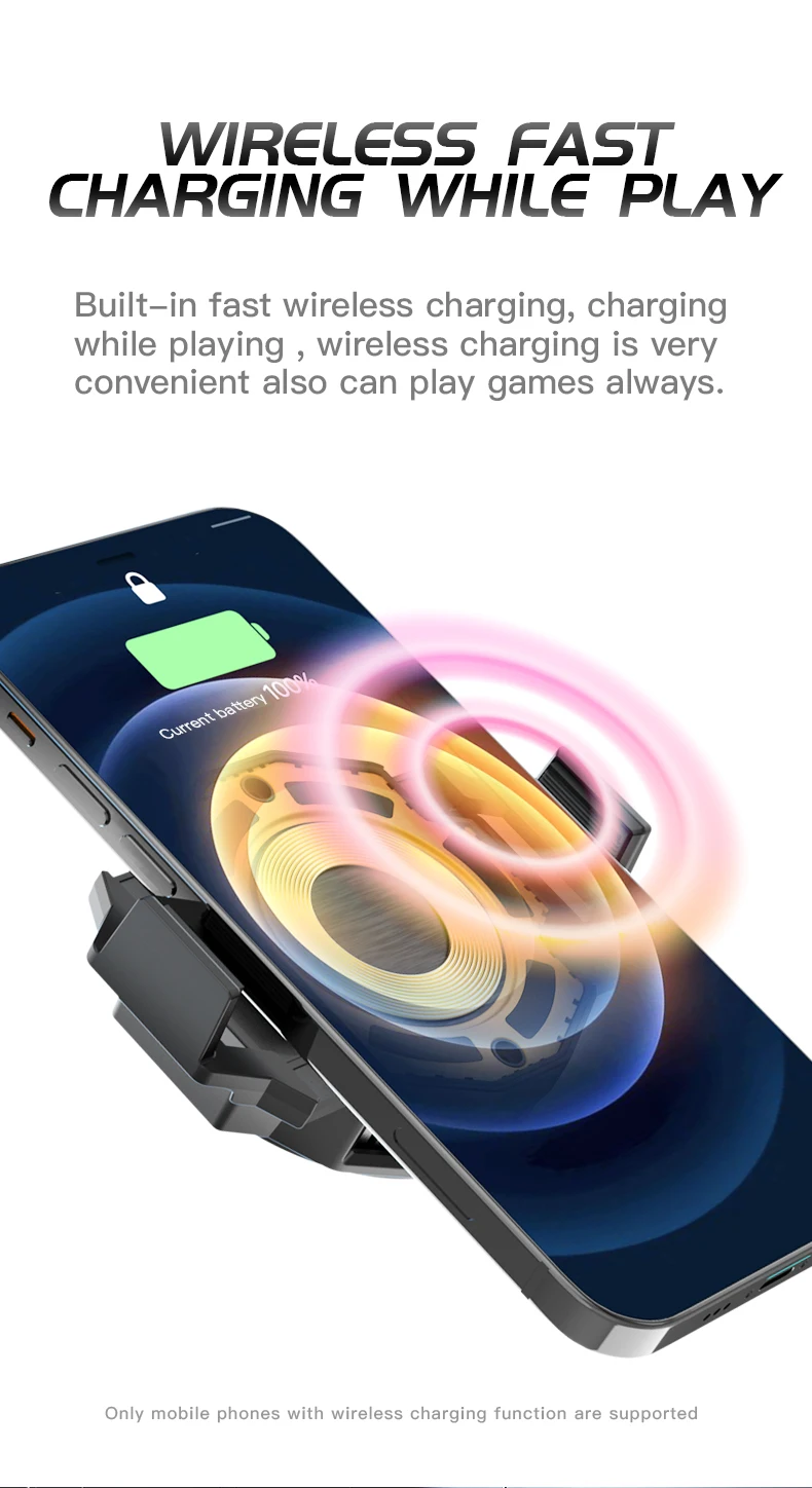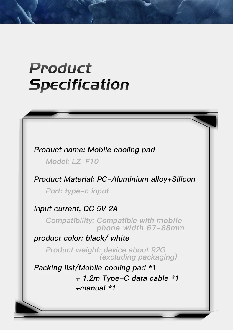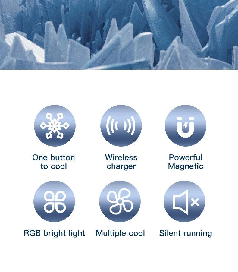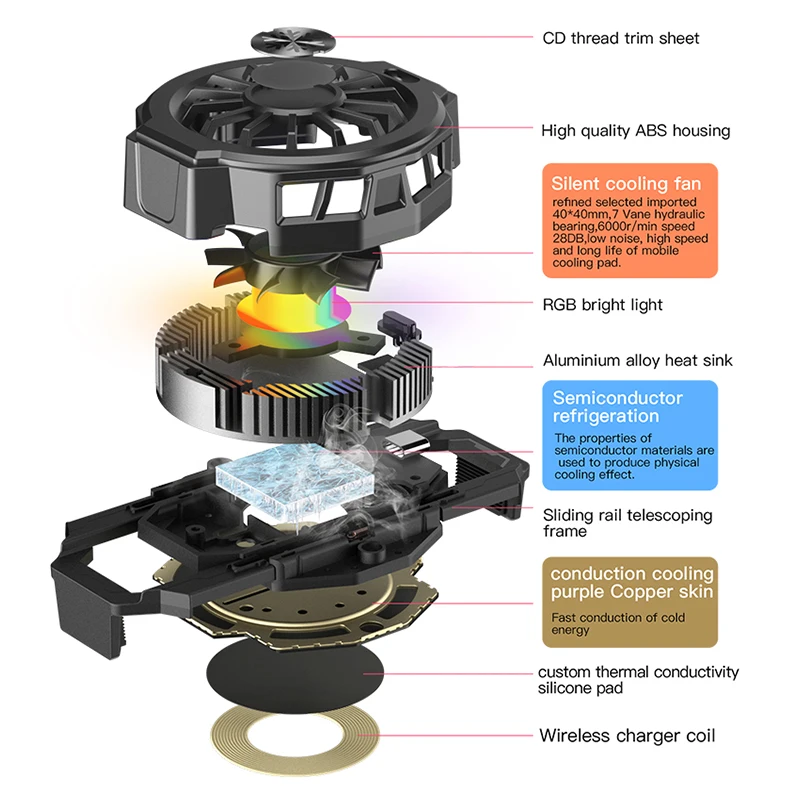 Портативный мобильный телефон Вентилятор охлаждения полупроводниковый беспроводной зарядный кулер немой RGB светильник радиатор для смартфона планшета IPadОсобенности:Шесть основных функций: 1 секундное охлаждение, Беспроводная зарядка, Мощное магнитное притяжение, цветное освещение RGB, рассеивание тепла, бесшумная работа-Около 3000мм ² большая площадь холодильного оборудования для решения проблемы замедления вызванной тепловым производством-Алюминиевый плавник воздуховода + Бесшумный Гидравлический мотор, двойное шумоподавление, уничтожьте врага в первый раз.-Полупроводниковое охлаждение + тепловыделение со всех сторон, удовлетворяющее игроков/Хостов для длительных сражений.-Встроенная быстрая Беспроводная зарядка, воспроизведение во время зарядки, избавление от оков линии. (Поддерживает только мобильные телефоны с функцией беспроводной зарядки)-Защита от низкой температуры без нагрузки + высокотемпературная защита вентилятора для предотвращения перегрузки и неисправности оборудования-Адаптируется к различным разным размерам мобильных телефонов, совместимо с шириной мобильного телефона 67- 88 мм-Прошел ряд международных сертификатов, безопасен в использовании! (Сертифицировано CE, RoHS, FCC)Спецификация:Название продукта: полупроводниковый мобильный телефон радиаторМатериал: АБС + алюминиевый сплав + керамикаИнтерфейс питания: Type-CИсточник питания: 5V2AПрименимые модели: 4,5-6,5 дюйм (ов)Ширина растяжения: 67-88 ммДанные вентилятора: 4000 об/минВес нетто продукта: 59 гПосылка включает в себя:1 X мобильный телефон кулер1 X Тип-C кабель для передачи данных (1,2 м)1 х Руководство