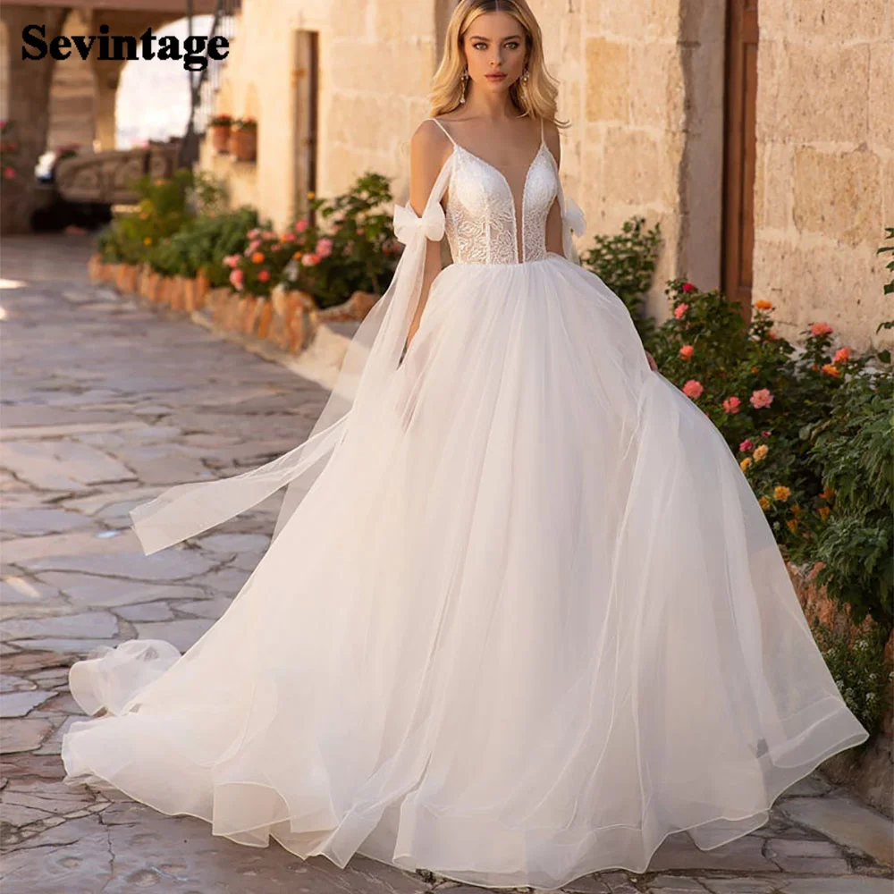 Свадебное платье Sevintage, с блестками, с V-образным вырезом, на бретелях, с бантом, с аппликацией, из тюля, в стиле бохо, 2021
