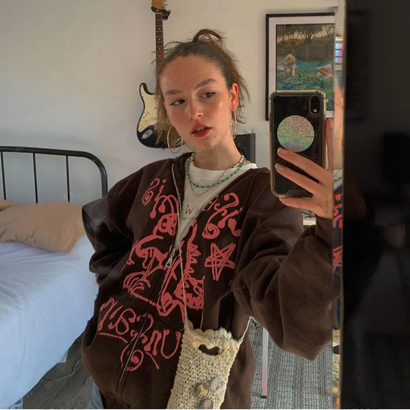 Женская толстовка с капюшоном Y2K, винтажная Осенняя кофта на молнии с длинным рукавом, топ в стиле Харадзюку, в готическом стиле