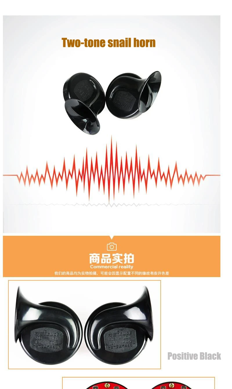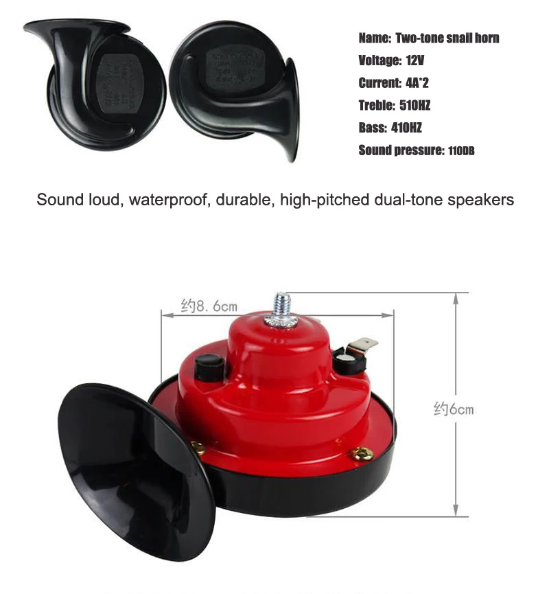 Особенности:100% новый и высококачественный12 В супер громкие воздушные рожки, предупреждение, которое нельзя игнорировать.Громкий автомобиль авто грузовик электромобиль гудок Улитка гудокУникальный дизайн и модный стильПростая установка, погодостойкий ПВХ и оцинкованный металл, очень громкий.Спецификация:Цвет: черный, красныйМатериал: ПКНапряжение: 12 ВУровень звука дБ: 110 дБE маркировка: низкая 410 Гц, высокая 510 Гц