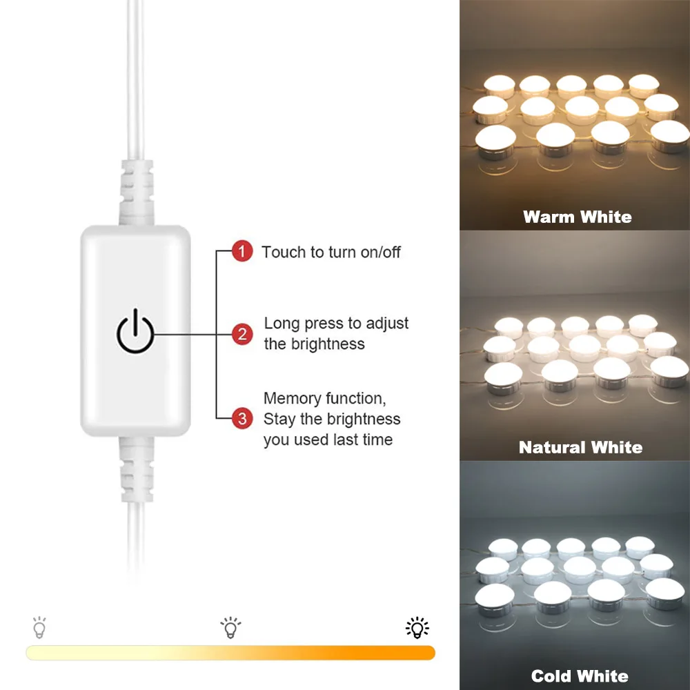 2/6/10/14 лампы для макияжа Зеркала, светодиодный комплект, Голливудский стиль светодиодный ная лампа для зеркала с лентой и USB-кабелем, сенсорный переключатель, светодиодная лампа для зеркала с регулируемой яркостью для макияжа, туалетного столика и зеркала для ваннойОписание:Особенности:Светодиодные лампочки в голливудском стиле с регулируемой яркостью обеспечивают макияж в темноте. Лампочки 3000-5000K рекомендуются профессиональными визажистами. Он мягкий и не ослепляющий, благодаря чему ваши глаза не будут болеть от света, и это не будет проблемой, чтобы наверстать форму в течение длительного времени.Умный сенсорный диммер и сенсорный диммер, вы можете настроить яркость в любое время в соответствии с вашими потребностями. Позволяет расслабить макияж с идеальной яркостью и создать идеальный макияж.2/6/10/14 лампочек, максимальная длина 19 футов (включая размеры после растяжения). Длину можно свободно регулировать в соответствии с вашими потребностями, чтобы набор для макияжа оставался красивым и аккуратным.Понадобится всего несколько минут, чтобы легко прикрепить его непосредственно к зеркалу, раме или стене, а затем подключить USB-кабель.Эта светосветильник лента «сделай сам»-обязательный аксессуар для светильник кого зеркала для макияжа с ярсветильник том для макияжа, съемки и селфи, а также для украшения столешниц и столешниц вашего туалетного столика, гардеробная и ванная. Это также отличный подарок для женщин, девушек, молодых и старых, наслаждайтесь нашим освещением косметического зеркала!Спецификация:Количество лампочек: 2/6/10/14 лампочекНапряжение: 5 вольтМощность: 2 лампочки (3 Вт), 6 лампочек (7 Вт), 10 лампочек (10 Вт), 14 лампочек (11 Вт)Цвет светильник: естественный белый, 3 цвета s (включая естественный белый, холодный белый, теплый белый)Тип переключателя: сенсорный переключатель, сенсорный переключательМатериал: пластик светодиодныйИсточник питания: USB-кабельРазмер корпуса лампы: 3,7*3,7*2,3 см (1,4*1,4*0,9 дюйма)Люмен: 2 лампы (лм), 6 лампочек (лм), 10 лампочек (лм), 14 лампочек (лм)CRI: >70Посылка входит:1 * зеркальный светильникЛента (количество соответствующих лампочек)Присоска (количество соответствующих лампочек)