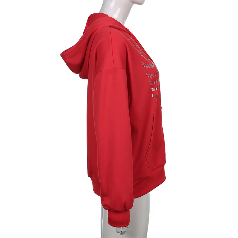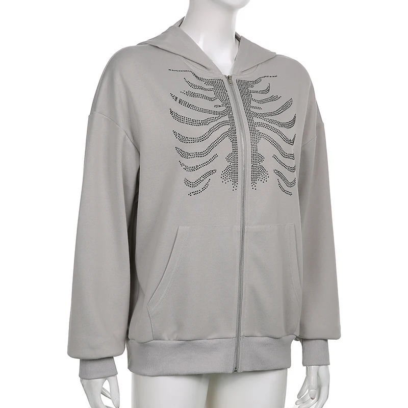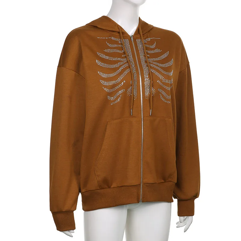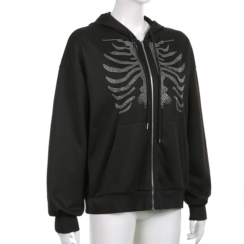 Y2K Стразы худи скелет Женская Осенняя уличная одежда на молнии гот...