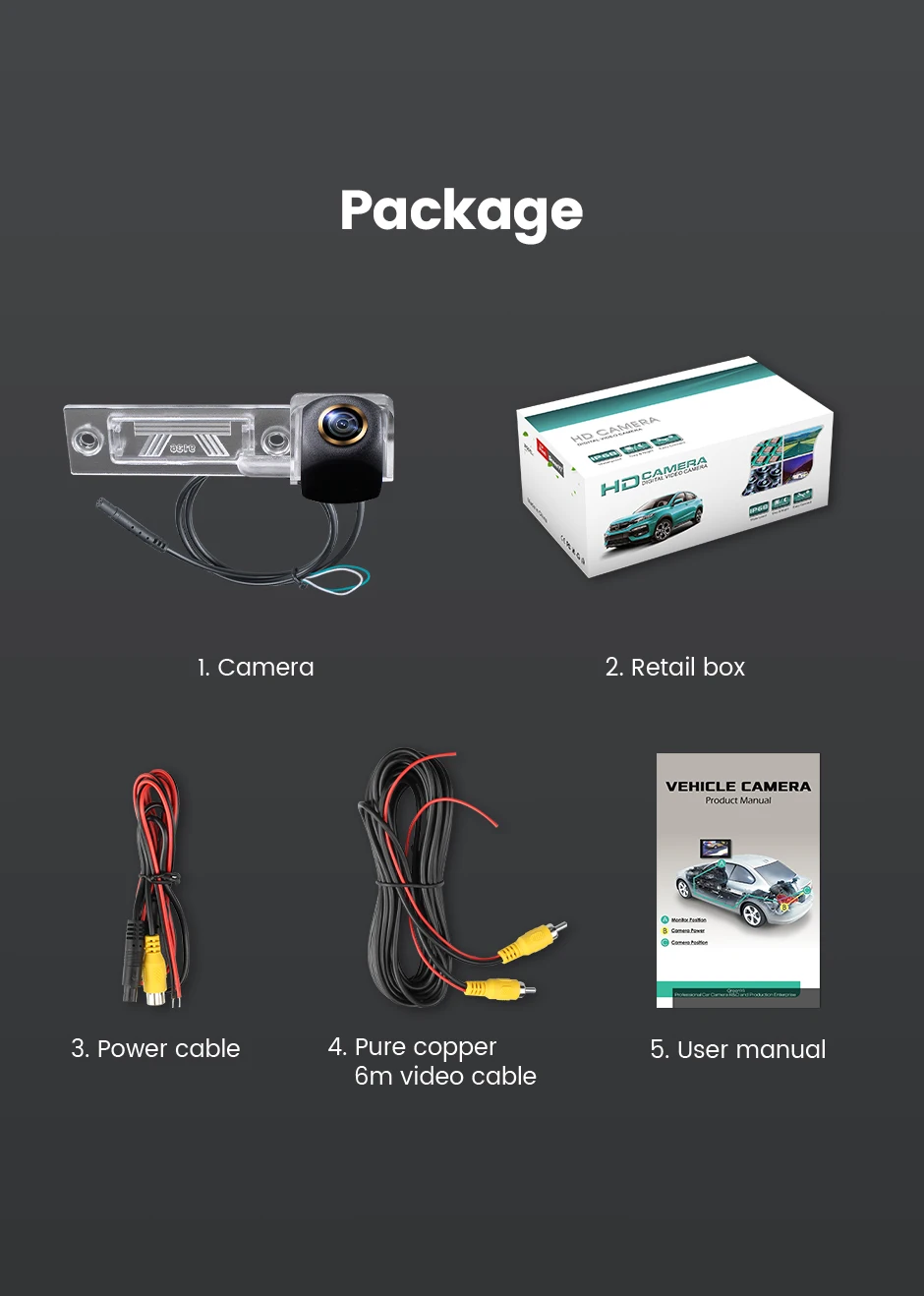 1. Камера заднего вида2. Розничная коробка3. Кабель питания4. Чистый медный 6 м видео кабель5. Руководство пользователя
