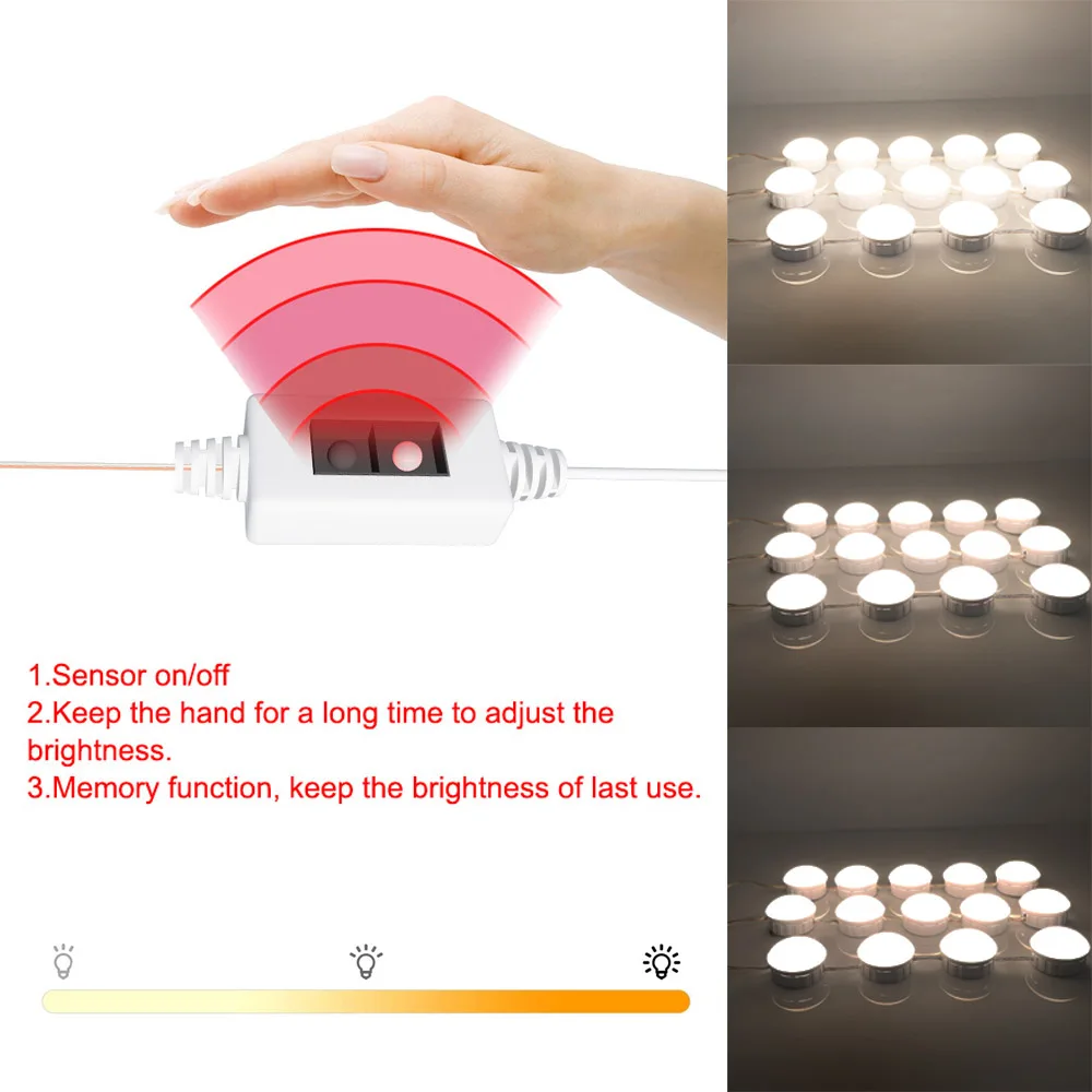 2/6/10/14 лампы макияж зеркало с подсветкой светодиодный комплект Голливуд Стиль светодиодный косметическое зеркало с подсветкой LED лампа с лентой и USB кабель Сенсор переключатель светодиодный косметическое зеркало с регулируемой яркостью зеркало с подсветкой LED лампа для макияжа туалетный столик и Ванная комната зеркалаОписание:Особенности:Светодиодный светильник с регулируемой яркостью в голливудском стиле обеспечивает большую яркость макияжа в темноте. 3000-5000K Светильник лампы рекомендуются профессиональными визажистами. Он мягкий и не ослепляющий, поэтому светильник не повредит вашим глазам, и это не проблема, чтобы компенсировать долгое время.Умный переключатель включения/выключения сенсорного диммера и диммер датчика, вы можете настроить яркость в любое время в соответствии с вашими потребностями. Позволяет расслабить макияж под идеальной яркостью и представить идеальный макияж.2/6/10/14 ламп, максимальная длина составляет 19 футов (с указанием размеров после растягивания). Длину можно свободно регулировать в соответствии с вашими потребностями, чтобы сохранить красивый и аккуратный макияж.Это займет всего несколько минут, чтобы легко прикрепить его непосредственно к зеркалу, раме или стене, а затем подключить usb-кабель.Этот зеркальный светильник DIY-это обязательный аксессуар для создания вашего косметического зеркала под светильник ed, яркий светильник s для макияжа, съемки и Селфи, а также украшения ваших столешниц и столешниц, гардеробная и ванная комната. Это также отличная идея для подарка женщинам, девушкам и взрослым, наслаждайтесь использованием нашего косметического зеркала!Спецификация:Количество ламп: 2/6/10/14Напряжение: 5 вольтМощность: 2 лампы (3 Вт), 6 ламп (7 Вт), 10 ламп (10 Вт), 14 ламп (11 Вт)Светильник, цвет: натуральный белый, 3 цвета (включая натуральный белый, холодный белый, теплый белый)Тип переключателя: сенсорный выключатель, сенсорный переключательМатериал: пластик, светодиодныйИсточник питания: USB кабельРазмер корпуса лампы: 3,7*3,7*2,3 см (1,4*1,4*0,9 дюймов)Люмен: 2 лампы (140lm), 6 ламп (420lm), 10 ламп (830lm), 14 ламп (980lm)CRI: >70Посылка включает в себя:1 * зеркальный светильникЛента (количество соответствующих ламп)Присоска (количество соответствующих ламп)