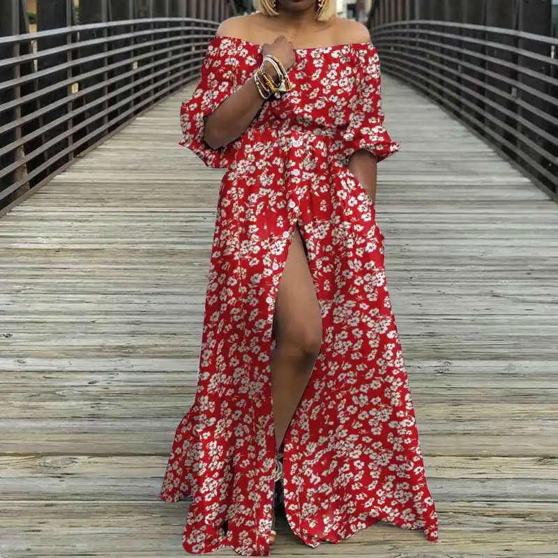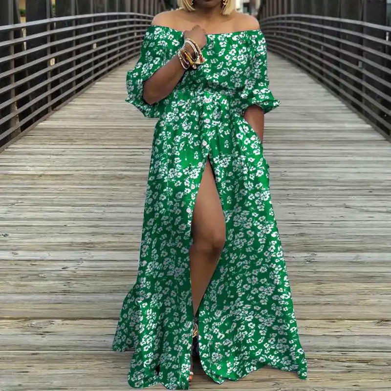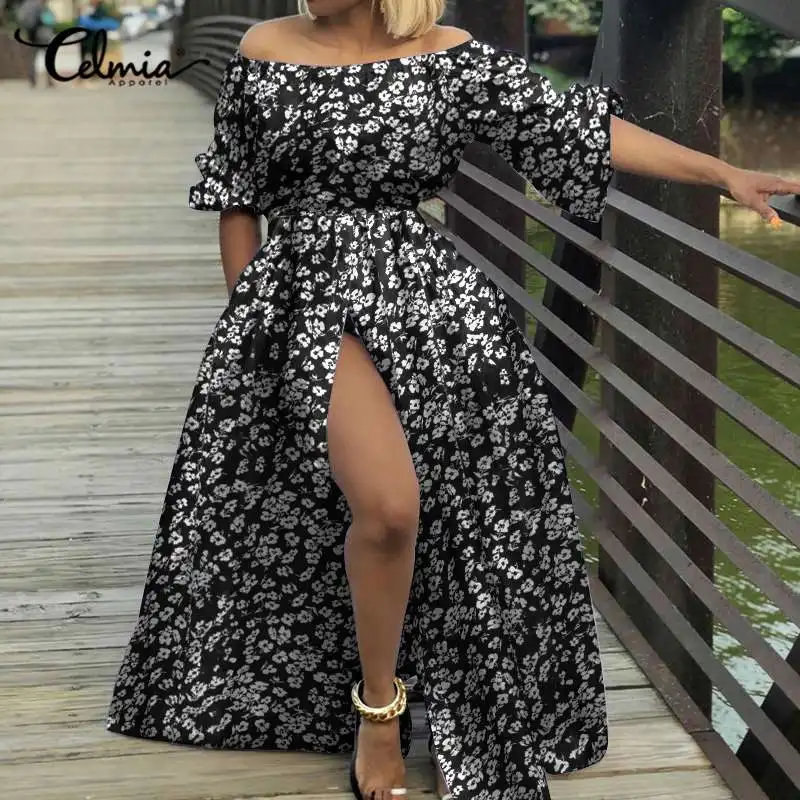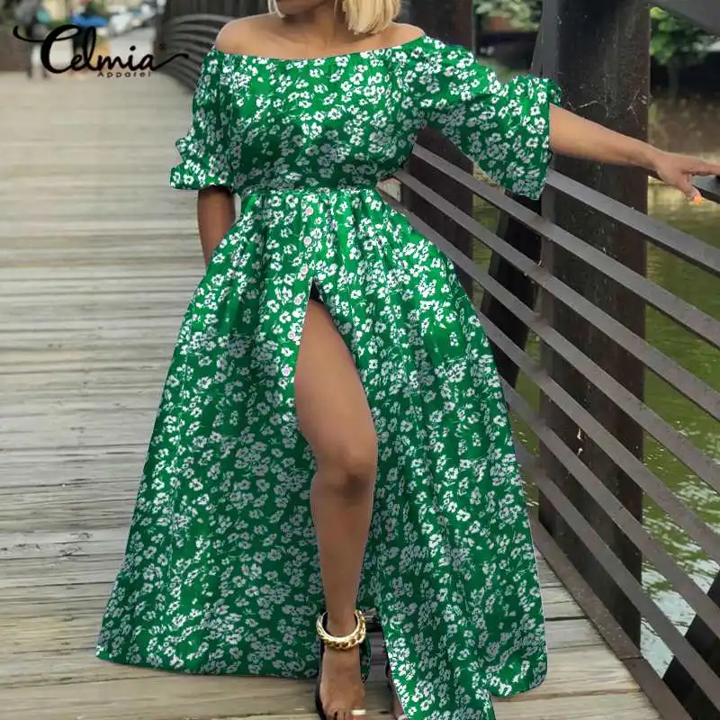 Женское платье макси Celmia, длинное сексуальное праздничное платье с высоким разрезом, открытыми плечами и рукавами-фонариками, 34