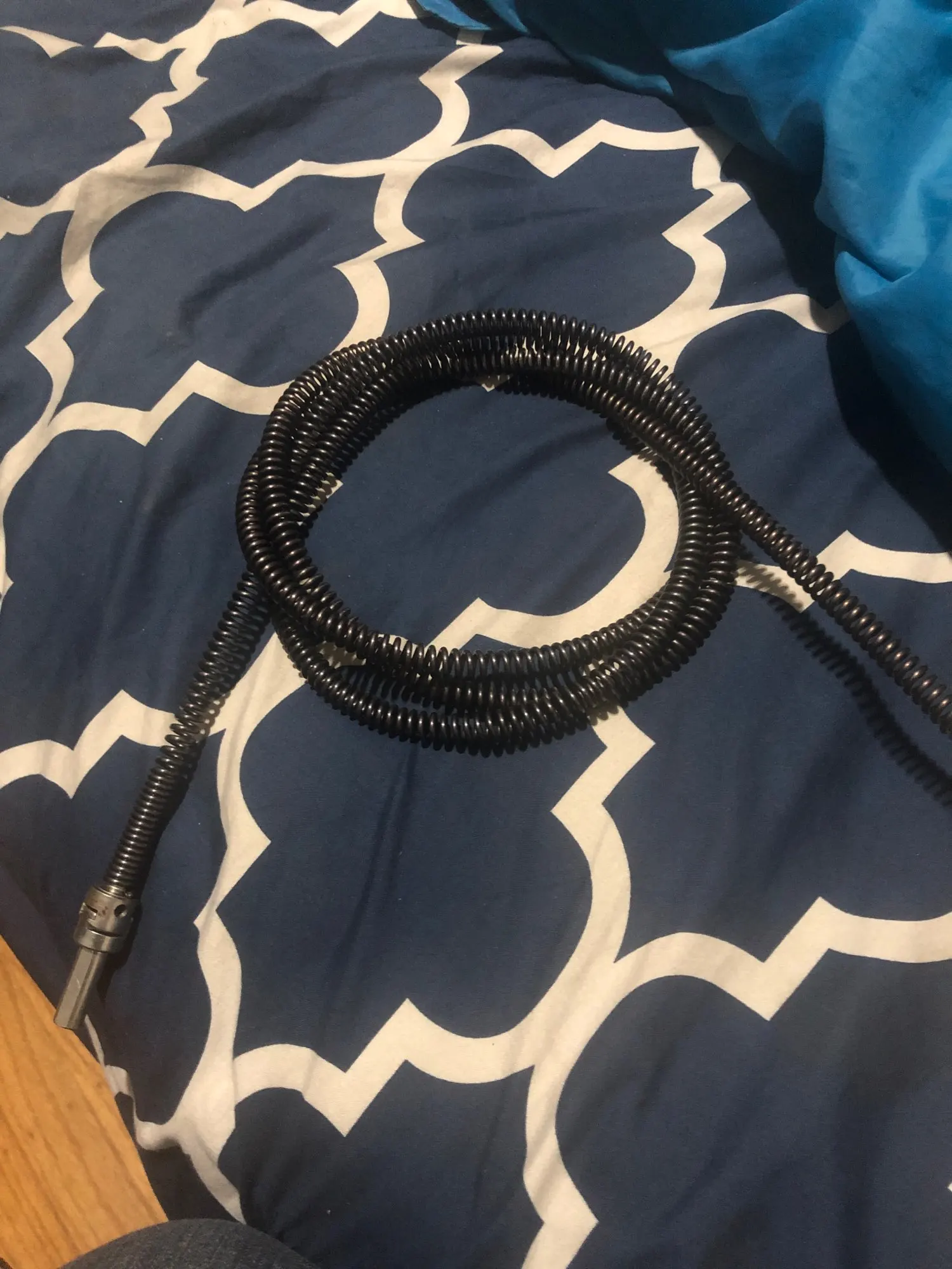Прочистил трубу - хорошая пружина, диаметр и жесткость достаточные, чтобы она не перекручивалась при вращении от шуруповерта.