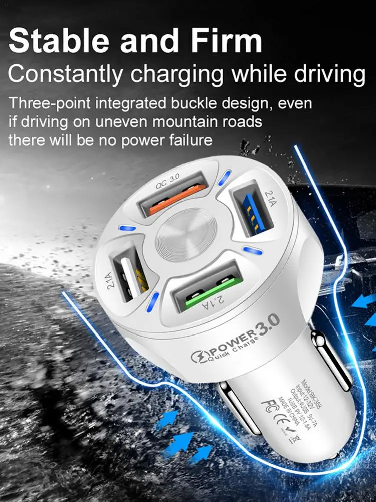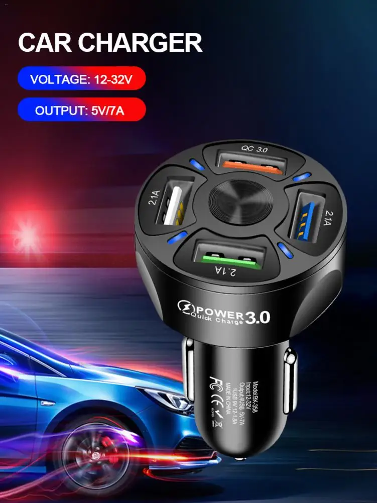 1. Компактный и практичный: отличный продукт и простой дизайн! Автомобильное зарядное устройство компактное и маленькое, поэтому оно не будет мешать чему-либо другому в автомобиле, но оно достаточно велико, чтобы вы могли одновременно заряжать несколько вещей.2. Быстрое зарядное устройство с четырьмя портами: зарядное устройство совместимо с технологией Quick Charge 3,0, одновременная зарядка четырех устройств на полной скорости. Каждый usb-порт имеет самоадаптивную выходную мощность. Быстрее, чем традиционная зарядка.3. Светящийся материал: светящийся материал облегчает поиск зарядного устройства во время вождения ночью. Автомобильное зарядное устройство сочетает в себе круглый и мягкий синий светодиодный светильник и многокольцевой дизайн, который легко найти и использовать в ночное время.4. Безопасный и надежный: Автомобильный адаптер оснащен высококачественной усовершенствованной защитой цепи и несколькими защитными элементами для предотвращения перезаряда, перегрузки по току и повреждения при высокой температуре. Когда это зарядное устройство USB быстро заряжается, внешний слой обладает высоким антиобжигающим эффектом для обеспечения его безопасности.5. Подходит для любого транспортного средства: автомобильное зарядное устройство подходит для любого стандартного адаптера прикуривателя 12 В/24 В и совместимо с любым зарядным устройством через USB.Спецификация:Размеры: около 40*70 мм/1,57 * 2.76inВыход: 5V/7AНапряжение: 12-32 ВЦвет: черный, белыйМатериал: АБС-пластикОписание напряжения:13,4-14,8 в, нормальное напряжение для запуска автомобиля.12V-12,8 V, нормального напряжения автомобильного статического зарядный шланг.11,4 в ~ 12 В, пожалуйста, замените зарядную трубку.12V или ниже, напряжение, которое должно быть меньше или равна 11,3 V, и сигнал тревоги будет мигать.Упаковочный лист:1 * Автомобильное зарядное устройство