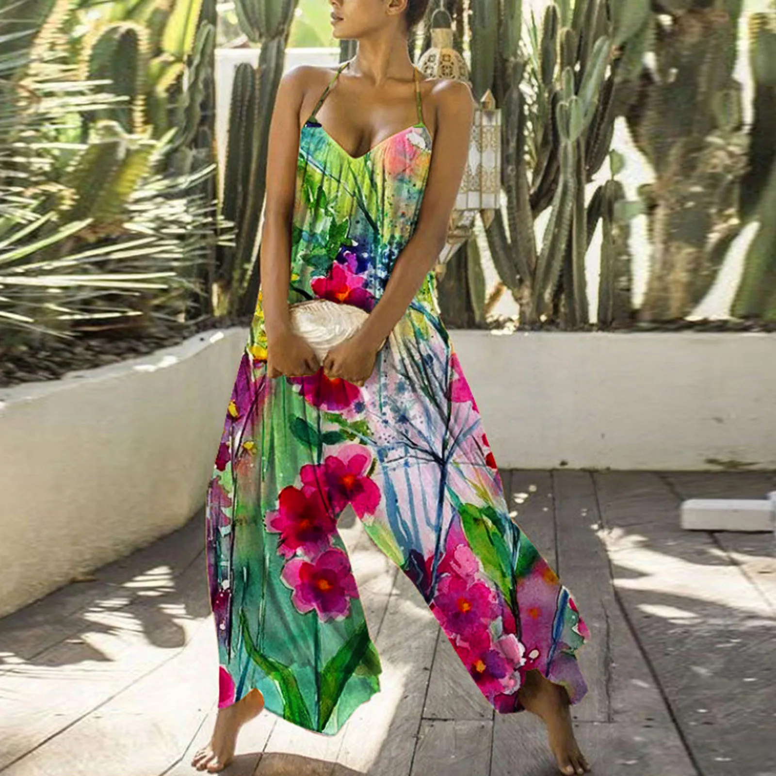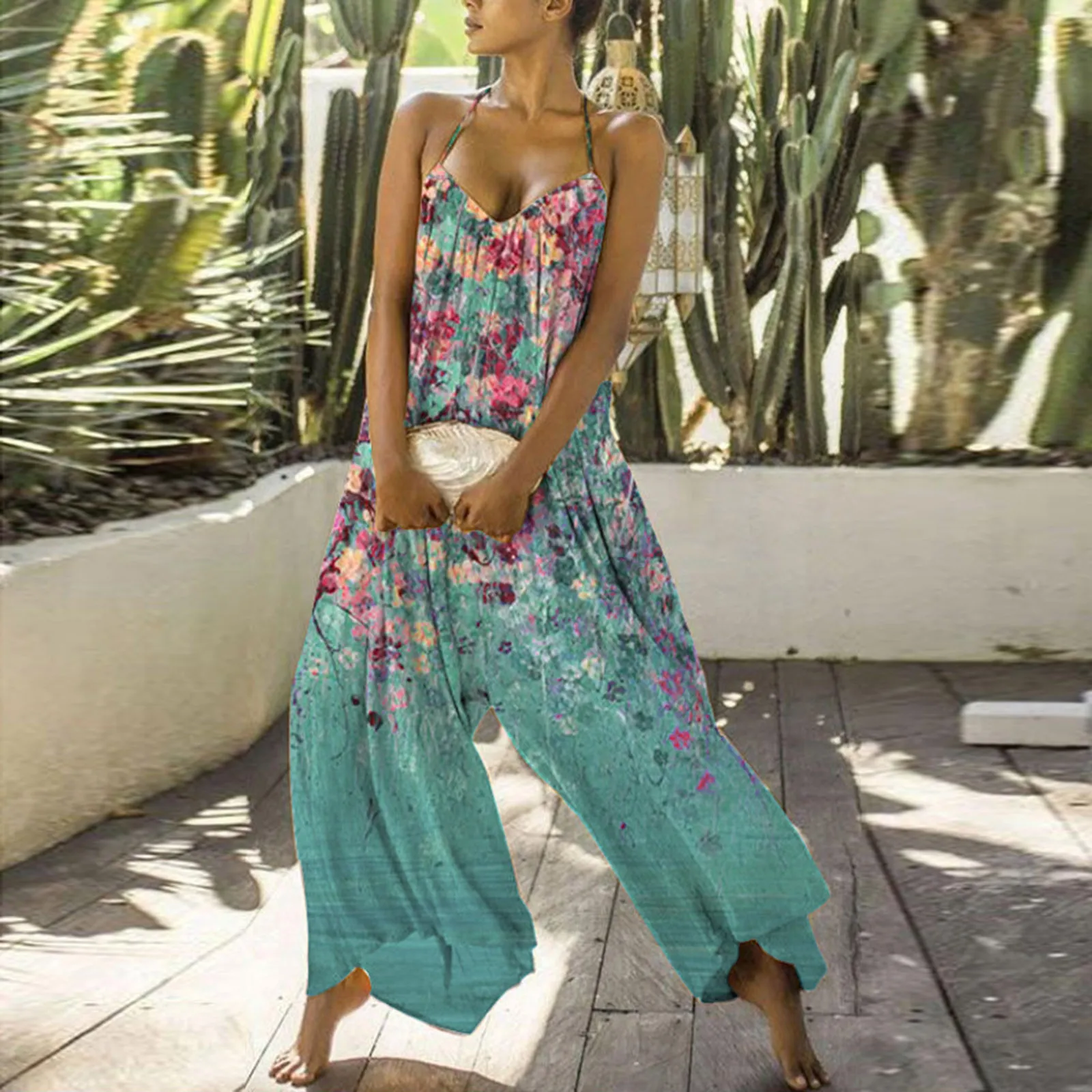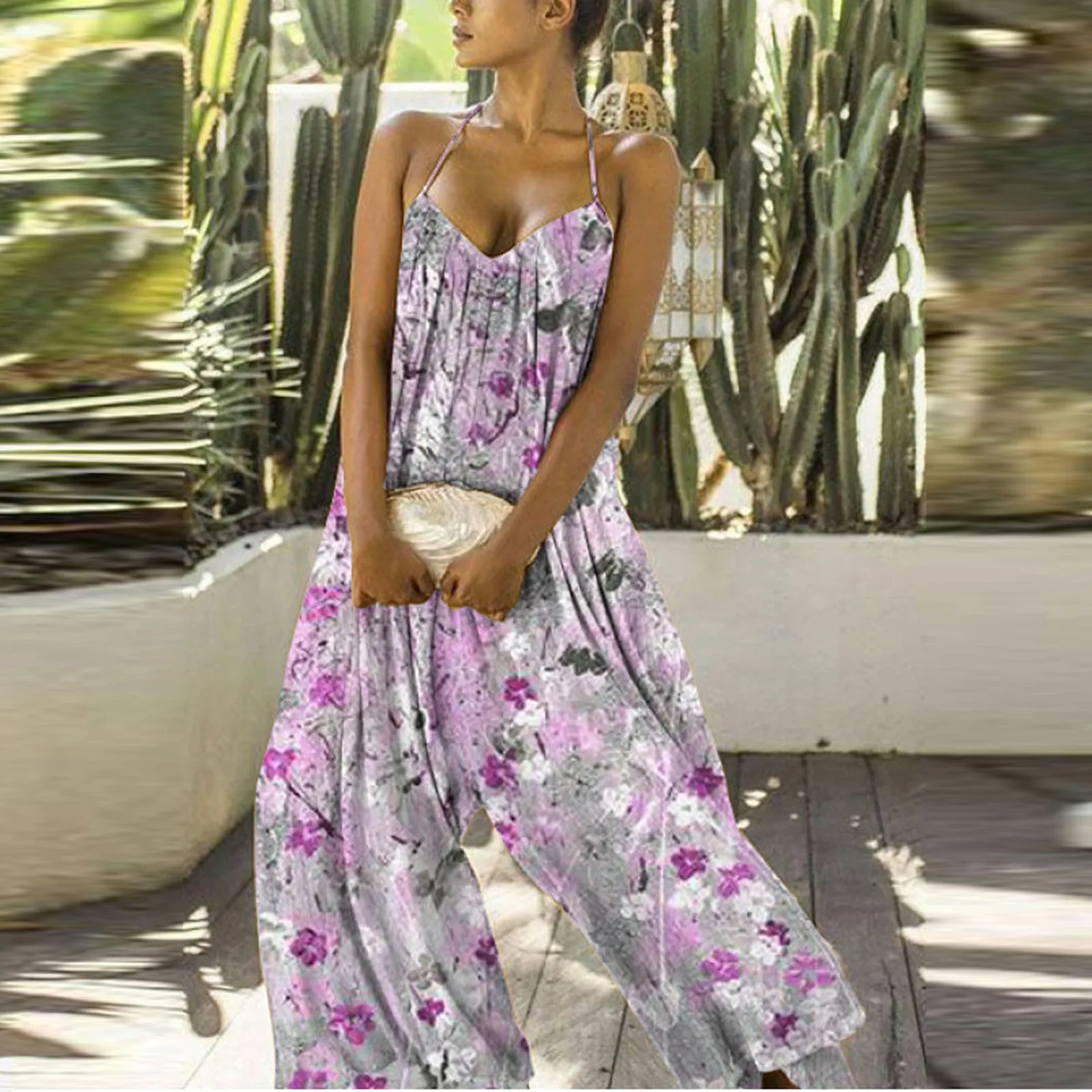 Женские комбинезоны в стиле бохо с V-образным вырезом и цветочным принтом, комбинезоны с широкими штанинами и открытой спиной, пикантные повседневные Свободные Комбинезоны без бретелек