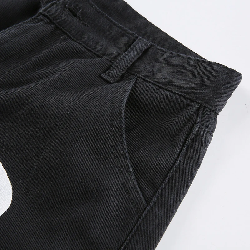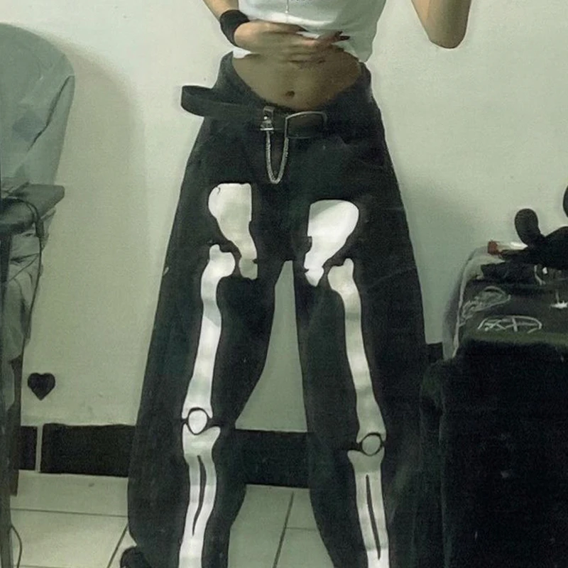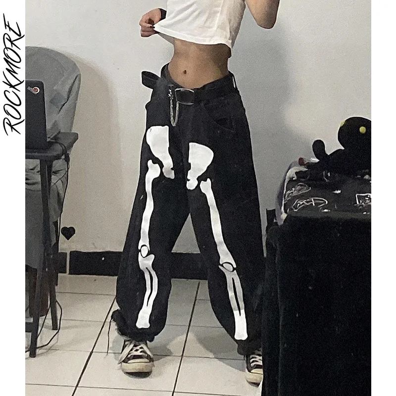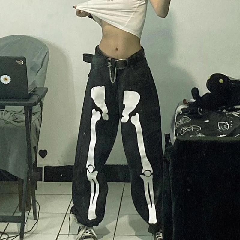 Черные женские джинсы с принтом скелета, свободные готические брюки...
