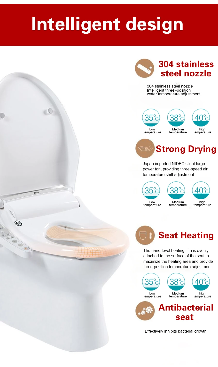 Функция: автоматическое переворачивание, регулировка температуры сиденья по температуре воды, сушка теплым воздухом, мытье ягодиц, женское мытье, самоочистка распылителя, перемещение положения распылителя