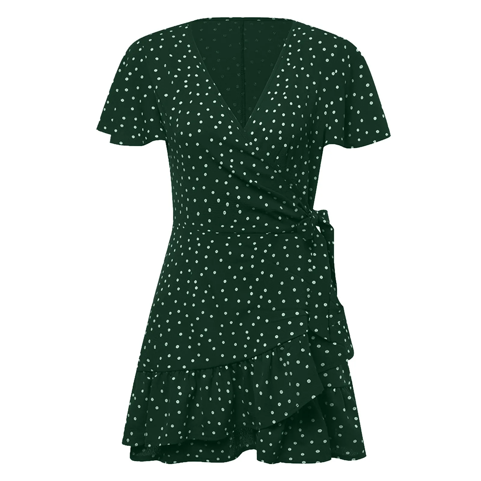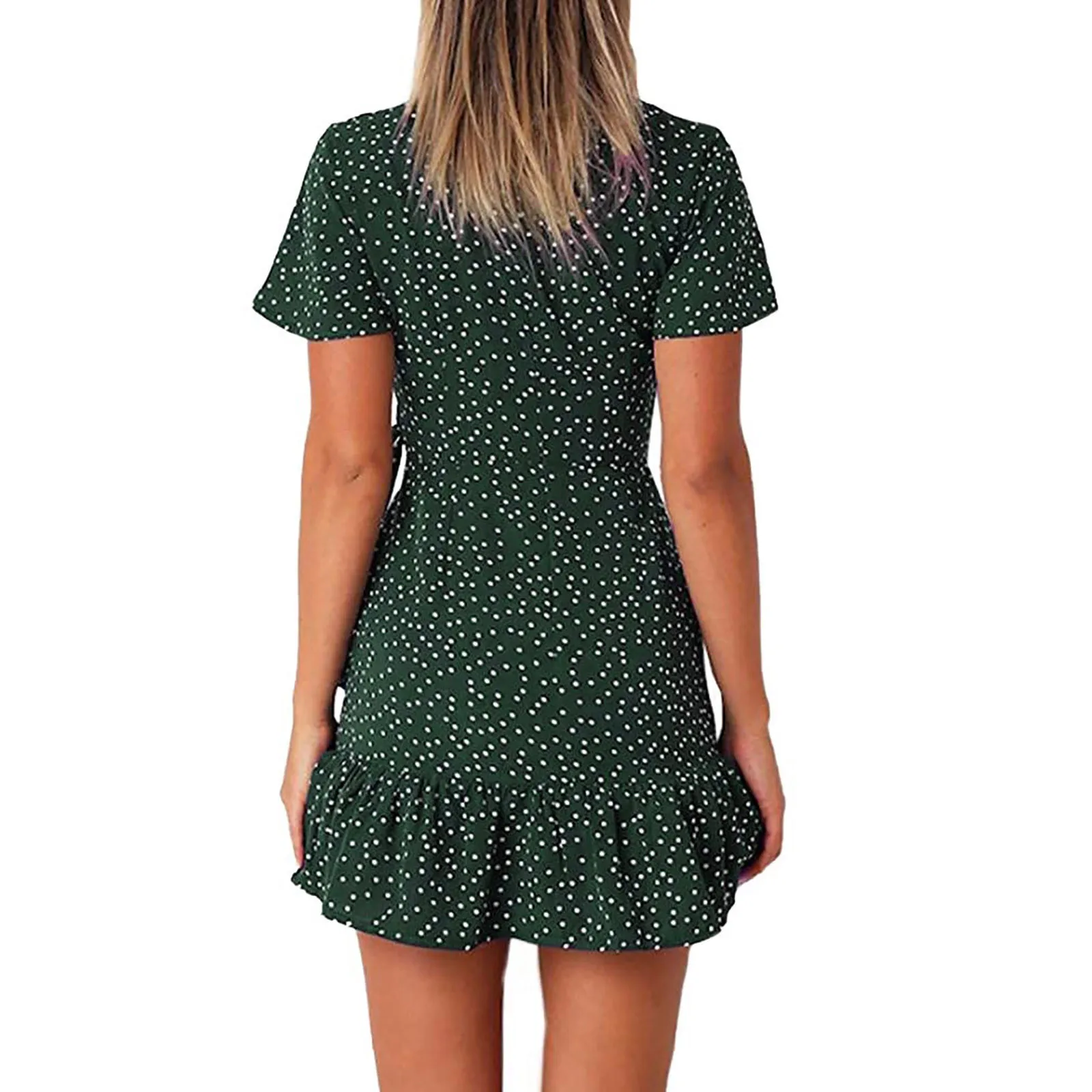 Женское модное платье с v-образным вырезом, плиссированное мини-платье с поясом, Повседневные Вечерние платья, летнее платье с коротким рукавом, свободное мини-платье зеленого цвета